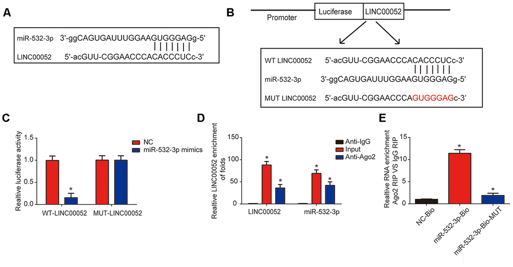 The interaction between miR-532-3p and LINC00052 is illustrated in Figure 3A. Luciferase WT-LINC00052 and MUT-LINC00052 reporter plasmids were constructed (Figure 3B). Inhibited reporter activity was observed upon transfection of WT-LINC00052 and miR-532-3p mimics (Figure 3C). To determine whether LINC00052 sponged miR-532-3p, RIP experiments were performed. miR-532-3p and LINC00052 were enriched in Ago2 pellet (Figure 3D). RNA pull-down assays using a miR-532-3p-bio probe produced a higher level of LINC00052 than pull-downs with negative control-bio or miR-532-3p probes (Figure 3E). These results indicate that miR-532-3p is a target of LINC00052.