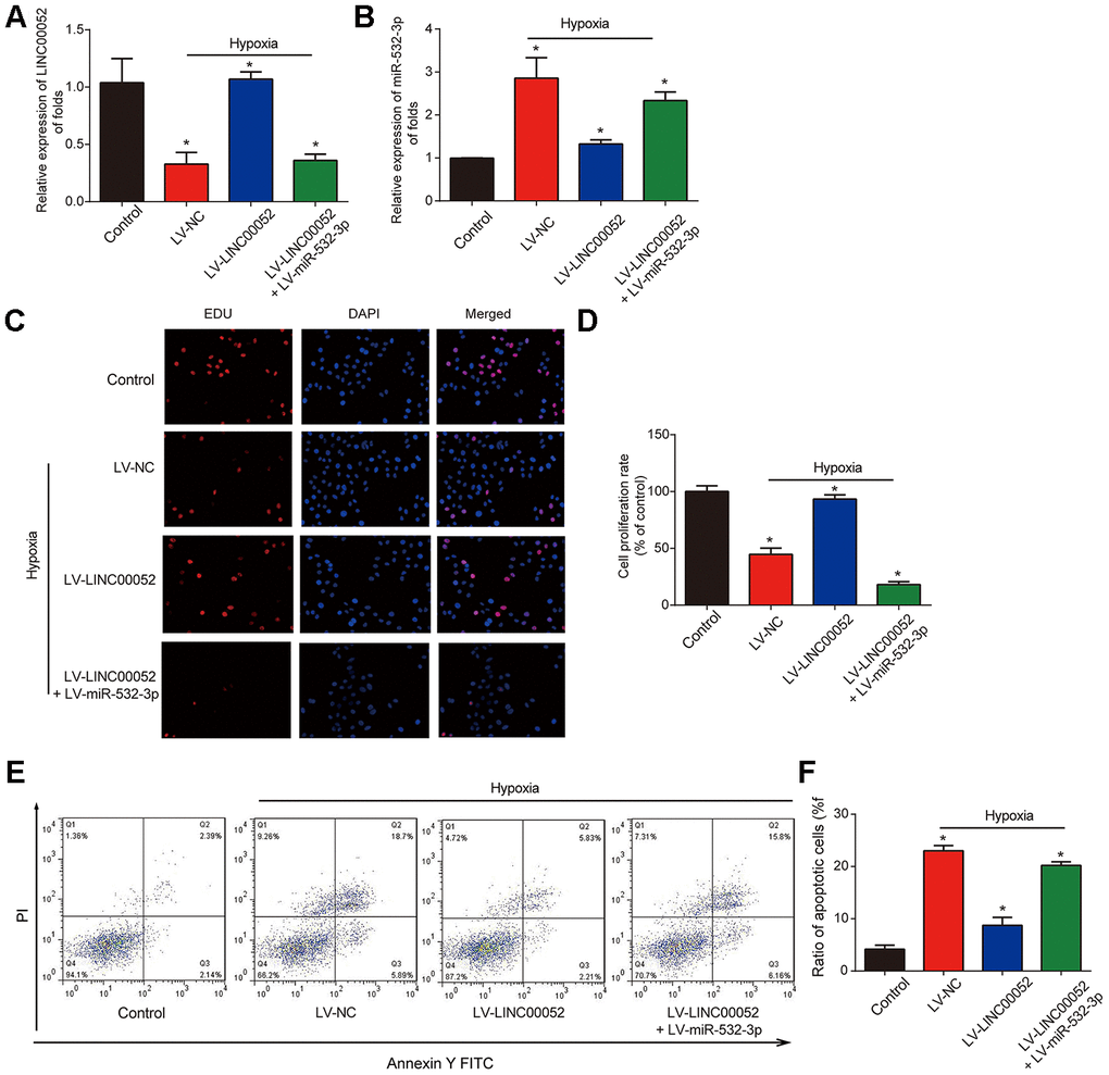 NRK-52E cells were infected with LV-LINC00052 and LV-miR-532-3p under hypoxia. We found that LINC00052 expression was elevated in NRK-52E cells (Figure 4A). Meanwhile, we found that miR-532-3p expression was repressed by LV-LINC00052 and this was reversed by LV-miR-532-3p (Figure 4B). Meanwhile, overexpression of LINC00052 rescued the reduction in cell proliferation, while overexpression of miR-532-3p exhibited the opposite effect (Figure 4C and 4D). Hypoxia-induced apoptosis was repressed by LV-LINC00052 overexpression in NRK-52E cells (Figure 4E and 4F). In contrast, miR-532-3p overexpression increased apoptosis, an effect which was inhibited by LINC00052. These results indicate that LINC00052 increases NRK-52E cell proliferation and represses apoptosis by sponging miR-532-3p.
