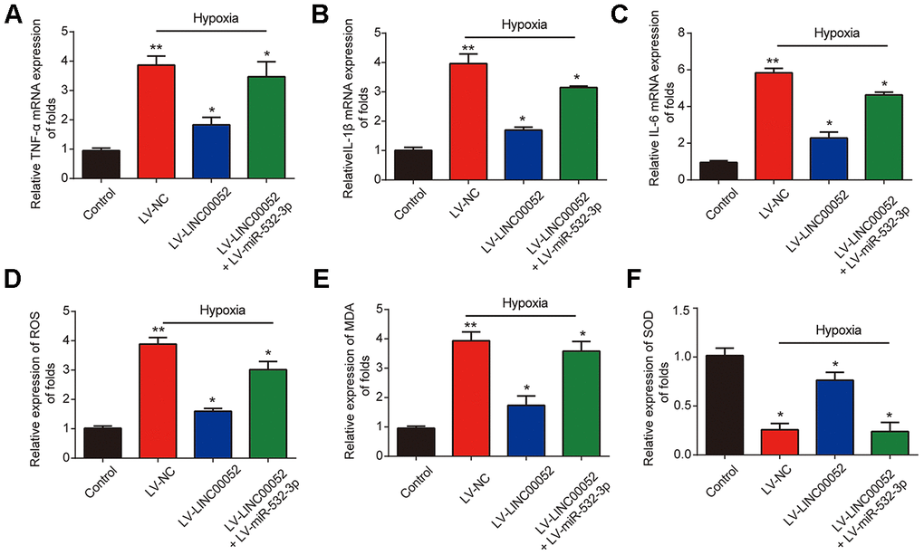 Furthermore, we measured the expression of TNF-α, IL-1β and IL-6 mRNA in NRK-52E cells infected with a combination of LV-LINC00052 and LV-miR-532-3p or LV-LINC00052 and LV-miR-532-3p using qRT-PCR. LINC00052 repressed inflammation in NRK-52E cells (Figure 5A–5C). TNF-α, IL-1β and IL-6 were repressed by LINC00052 and induced by miR-532-3p. The increases in ROS and MDA levels observed in NRK-52E cells were repressed by LINC00052 and further exacerbated by miR-532-3p, whereas SOD exhibited the opposite effect (Figure 5D–5F). These results suggest that LINC00052 affects inflammation and ROS levels in NRK-52E cells by modulating miR-532-3p.