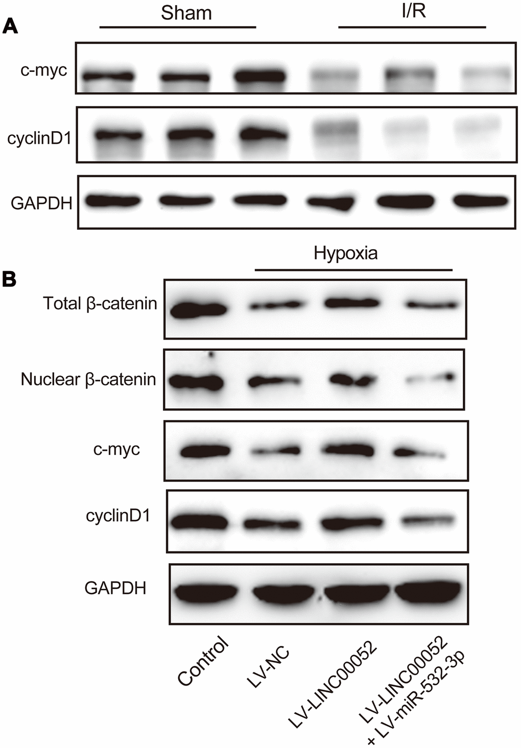 Inactivation of the Wnt/β-catenin pathway has been linked to AKI progression. We observed that levels of c-myc and cyclin D1 were decreased in renal tissue of AKI rats through IHC staining (Figure 6A). Subsequently, we found that hypoxic NRK-52E cells exhibit inactivation of Wnt/β-catenin signaling, and this signaling pathway was reactivated by LINC00052 by sponging miR-532-3p. β-catenin, c-myc and cyclin D1 protein expression was upregulated by LINC00052 and downregulated by miR-532-3p (Figure 6B). These results indicate that inactivation of Wnt/β-catenin pathway is involved in LINC00052-mediated AKI progression.