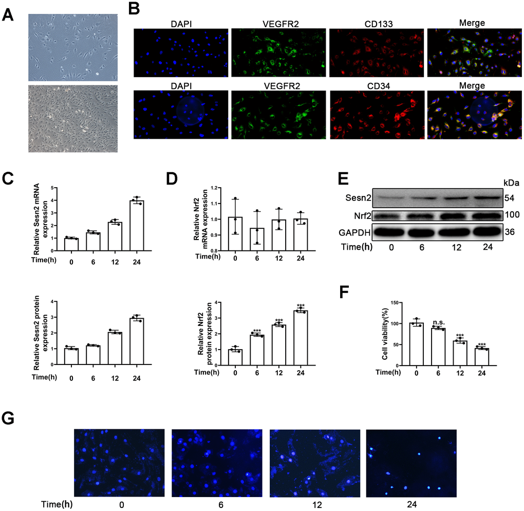 EPCs identification and detection of Sesn2 and Nrf2 protein expression in EPCs treated with Ang-II