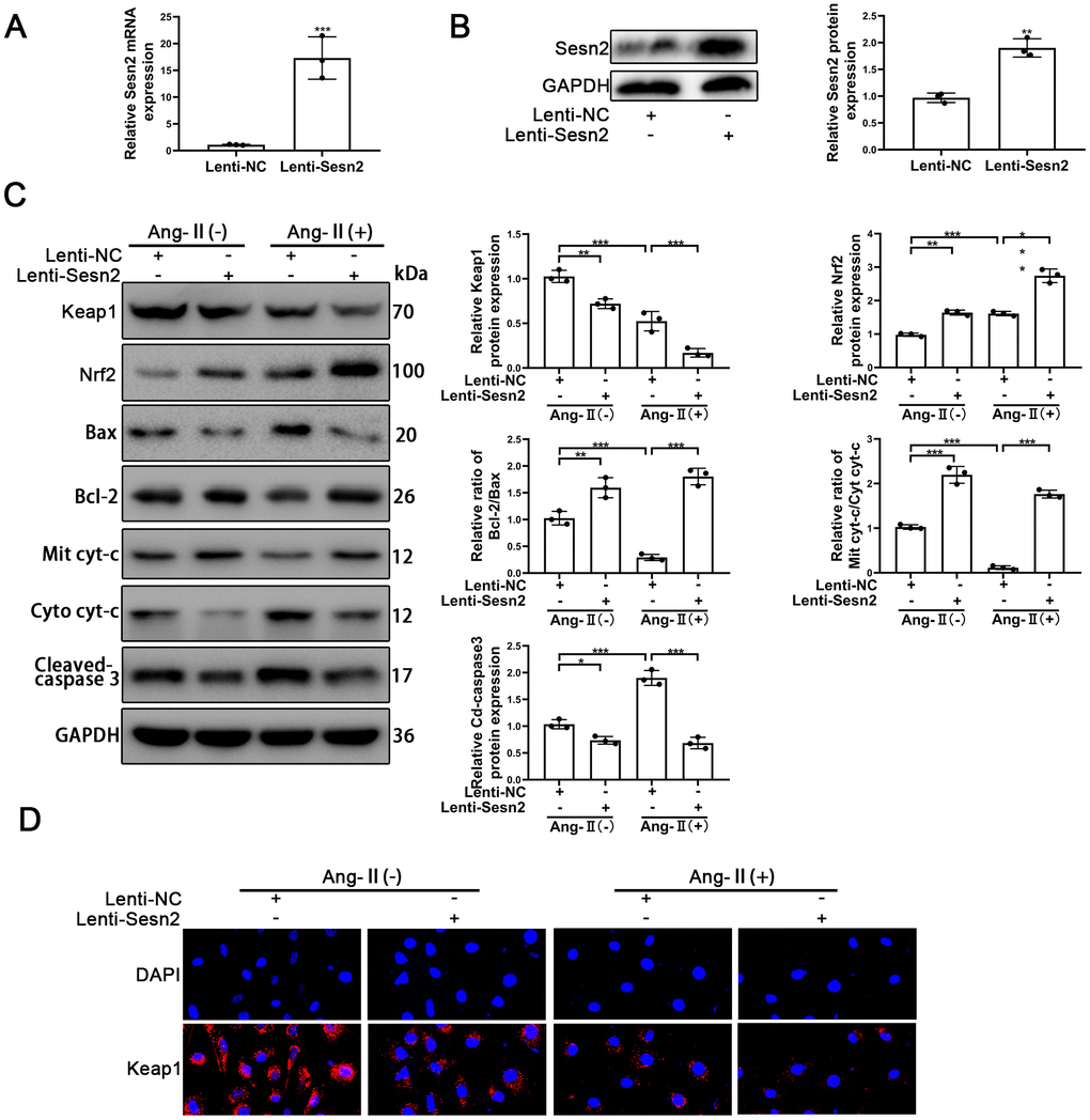 To investigate the role of Sesn2 in the EPCs treated with Ang-II, the LV3-pGLV-H1 + Puro plasmids with pcDNA-Sesn2 or control oligonucleotides (Lenti-Sesn2 and Lenti-NC) were designed such as to overexpress Sesn2 protein. The effect of inducing overexpression of Lenti-Sesn2 was confirmed by using qRT-PCR and Western blotting. The levels of Sesn2 mRNA were found to have been remarkably upregulated, and the levels of Sesn2 proteins were also significantly overexpressed (Figure 2A, 2B). We established that we achieved stable transfection of Lenti-Sesn2 and Lenti-NC in EPCs and these EPCs were used in following experiments. Recent research has reported that Keap1 induced downregulation of the levels and activity of Nrf2 [29, 30]. Therefore, the levels of Nrf2 and Keap1 proteins were measured by using Western blotting. As could be seen in Figure 2C, the treatments with Ang-II induced the decreased levels of Keap1 proteins and contrastingly increased the levels of Nrf2 proteins and the entry of Nrf2 to nuclear in EPCs (Supplementary Figure 2E). Interestingly, upregulation of Sesn2 was found to have further reduced the levels of Keap1 proteins and the entry of Nrf2 to nuclear in EPCs (Supplementary Figure 2E). We used immunofluorescence in order to further detect the levels of Keap1 proteins. The results indicated that levels of Keap1 proteins were reduced by the treatments of Ang-II. The immunofluorescence results indicated that there was downregulation of Keap1 proteins after the treatments of Ang-II, which Sesn2 upregulation consequently was able to further enhance this effect (Figure 2D). These results suggested that the levels of Nrf2 proteins were negatively regulated by Keap1 in EPCs. Thus, we postulated that upregulation of Sesn2 induced repression of Keap1 and thereby enhanced the levels of Nrf2 proteins.