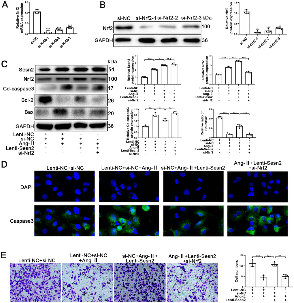 To further investigate whether or not Sesn2 protected EPCs from Ang-II treatment through promotion of Nrf2, we designed Small interfering RNA (si-RNA) to silence the expression of Nrf2 mRNA and proteins. EPCs containing Lenti-Sesn2 or Lenti-NC were transfected with si-Nrf2. As could be seen in Figure 3A, 3B, the levels of Nrf2 mRNA were reduced significantly, and the levels of proteins also were decreased remarkably in EPCs. We used Si-Nrf2-1 in the following experiments described hereafter. Firstly, we used Western blotting to detect the apoptotic markers including such as Cleaved-caspase3, Bcl-2, and Bax. Our results indicated that upregulation of Sesn2 induced decreased levels of Cleaved-caspase3 but silencing of Nrf2 was able to induce reversal of this role in EPCs (Figure 3C and Supplementary Figure 1D). There were opposite effects with regards to the ratio of Bcl-2/Bax in EPCs (Figure 3C and Supplementary Figure 2F, 2D). Importantly, we observed that silencing of Nrf2 did not result in a reduction of the levels of Sesn2 in Lent-Sesn2 + Ang-II + si-Nrf2 treatment group. Our results also indicated that upregulation of Sesn2 could enhance the levels of Nrf2 and the entry of Nrf2 to nuclear in the Lent-Sesn2 + Ang-II + si-NC treatment group (Figure 3C and Supplementary Figure 2F). These results suggested that Sesn2 promoted the levels of Nrf2 proteins. The results from immunofluorescence assessments confirmed that although the levels of Cleaved-caspase 3were downregulated by Lenti-Sesn2, in contrast, si-Nrf2 enhanced the levels of expression of Cleaved-caspase3 in EPCs (Figure 3D). In order to verify whether or not si-Nrf2 had an influence upon the migration of EPCs, we used transwell assays. The results from these assessments indicated that the migration of EPCs were repressed by the treatments of Ang-II and indicated that Sesn2 could reverse this effect. However, silencing of Nrf2 resulted in the inhibition of the positive effect of Sesn2 on EPCs exposed to Ang-II (Figure 3E). These results revealed that Sesn2 protected EPCs from Ang-II through promoting the expression of Nrf2.