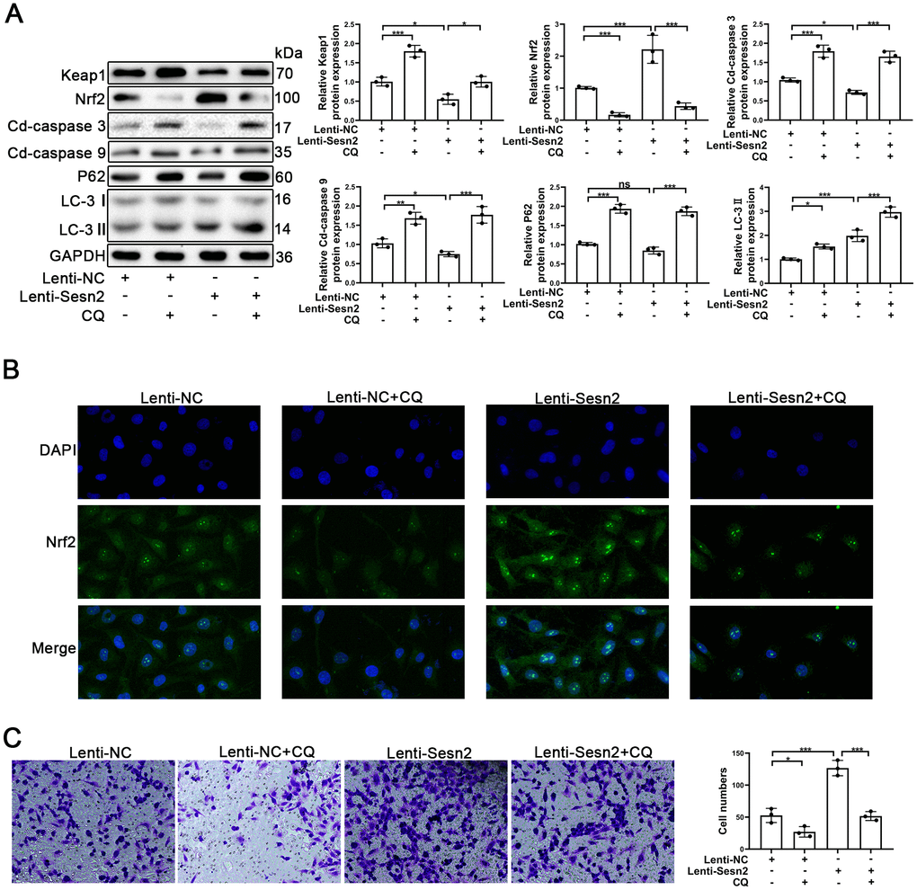 An important aspect of our research was to determine how Sesn2 promotes Nrf2 in EPCs as previously this was unknown. Previously, autophagy has been reported to serve as a mediator between Sesn2 and Nrf2. In the process of autophagy, Sesn2 was found to have induced the degradation of Keap1 and thereby promoted Nrf2 signaling through P62-dependent autophagy [33, 39]. To confirm the role of autophagy between Sesn2 and Nrf2, we used chloroquine (CQ, 10 μM) to treat EPCs transfected with either Lenti-Sesn2 or Lenti-NC. Our results indicated that CQ treatments alone were able to repress the levels of autophagy flux and influenced the dynamics of the Keap1/Nrf2 pathway. Restraint of autophagy was capable of inducing the impaired viability of EPCs (Figure 4A) [40, 41]. Accordingly, our results indicated that upregulation of Sesn2 was able to induce autophagy. Treatment with CQ further inhibited autophagy that was induced by overexpression of Sesn2 (Figure 4A). Chloroquine acted as an inhibitor of lysosomes and inhibited the fusion of autophagosomes and lysosomes. In this manner, the levels of LC-3II were increased as the autophagic flux was inhibited. The levels of expression of P62 confirmed such findings (Figure 4A). Interestingly, our results indicated that Keap1 was negatively expressed in EPCs when Sesn2 was correspondingly overexpressed. And, then consequently, Nrf2 protein expression and the entry to nuclear was increased in EPCs (Figure 4A and Supplementary Figure 3B). However, our results indicated that CQ inhibited autophagic flux induced by Sesn2, and then inhibited the degradation of Keap1. Further, Keap1 repressed the levels of Nrf2. Meanwhile, Keap1 combined with Nrf2and thereby resulting in the retention of Nrf2 in cytoplasm (Figure 4A and Supplementary Figure 3B). We used immunofluorescence to determine the distribution of Nrf2 in EPCs. The results clearly indicated that Sesn2 promoted Nrf2 to enter the nucleus of EPCs while CQ reversed this phenomenon (Figure 4B). Finally, we evaluated the effect of autophagy upon the migration of EPCs and found that CQ could reduce the promotion of migration of EPCs by Sesn2. These results demonstrated that autophagy might have acted as an important mediator in the Sesn2/Nrf2 signaling pathway.