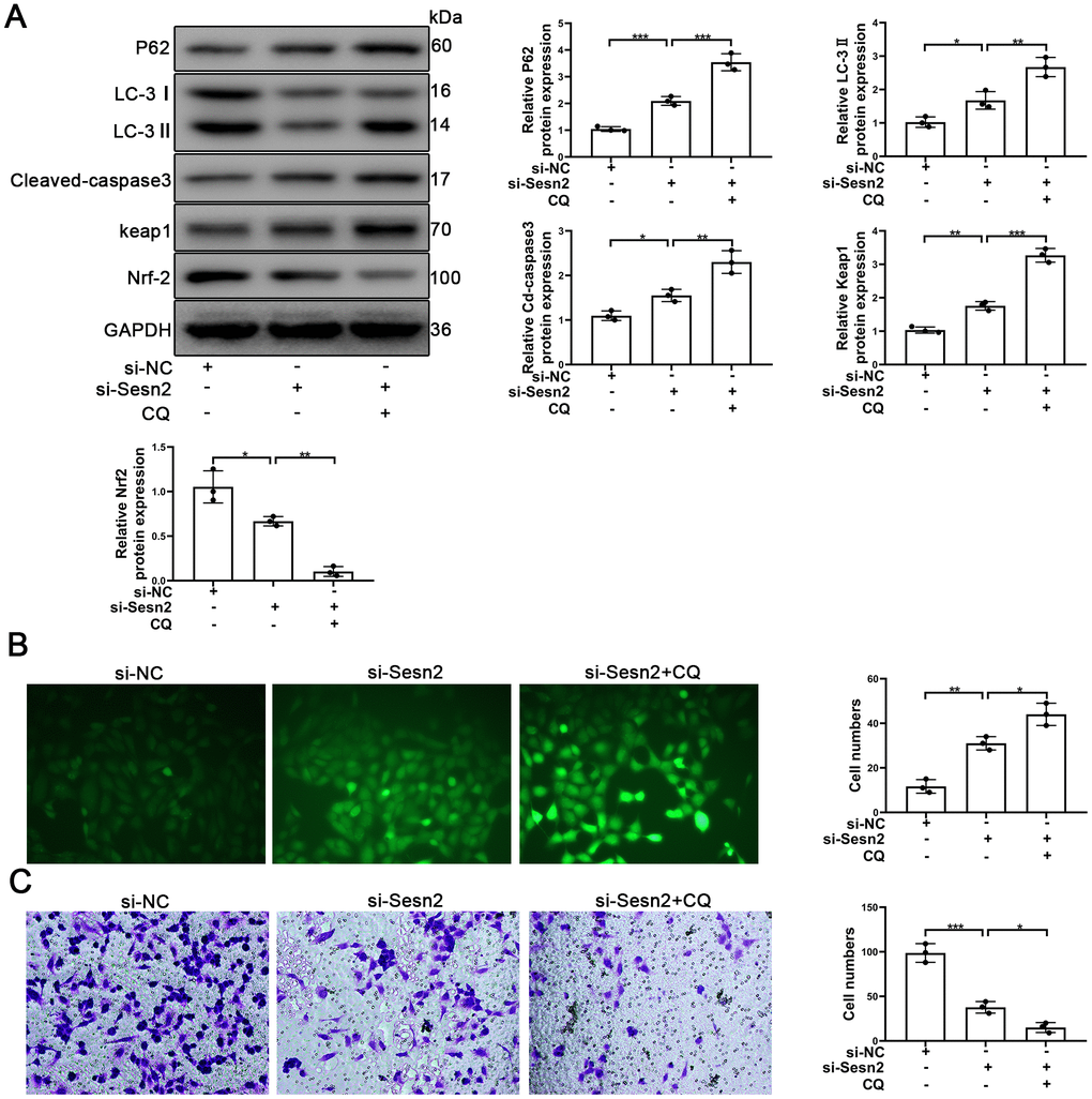 To further determine whether or not autophagy mediated the Sesn2/Nrf2 signaling pathway, we designed si-RNA to silence the expression of Sesn2. As shown in Supplementary Figure 2B, 2C, the levels of Sesn2 mRNA and proteins were reduced dramatically. We used si-Sesn2-1 in the following experiments described hereafter. Silencing of Sesn2 was found to have inhibited the upstream dynamics of autophagic flux, whereby we observed a decrease in LC-3 and an increase in P62 (Figure 5A). Meanwhile, the levels of Keap1 proteins were enhanced whereas the levels of Nrf2 and the entry of Nrf2 to nuclear were reduced significantly (Figure 5A and Supplementary Figure 3C). The rates of EPCs apoptosis also were found to have been increased when Sesn2 was silenced by si-Sesn2 (Figure 5A). Interestingly, CQ was found to have inhibited the fusion of autophagosomes and lysosomes, which ultimately resulted in the inhibition of the downstream dynamics of autophagy. Thus, the levels of P62 and LC-3 were increased when EPCs were treated with CQ (Figure 5A). The CQ treatment was found to have further suppressed Nrf2 levels and the entry to nuclear because the CQ treatment reduced the degradation of Keap1 through P62-dependent autophagic flux (Figure 5A and Supplementary Figure 3C). Many studies have already reported that as an antioxidant transcription factor, Nrf2 can activate many antioxidant enzymes such as to repress ROS levels in cells [42–44]. In our experiments, we found that ROS levels were increased remarkably in EPCs transfected with si-Sesn2 and found that CQ enhanced this effect (Figure 5B). Moreover, silencing of Sesn2 was found to have also inhibited the migration of EPCs, and CQ further repressed the migration of EPCs (Figure 5C). In summary, these results indicated that Sesn2 upregulated the Keap1/Nrf2 signaling pathway through inducing autophagy.