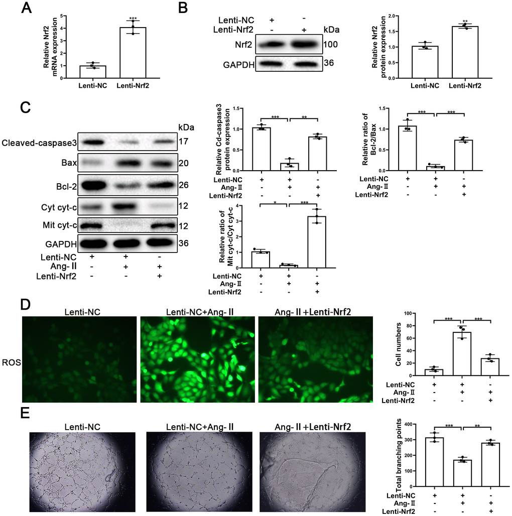 To confirm the role of Nrf2 in Ang-II-treated EPCs, the LV3-pGLV-H1 + Puro plasmids with pcDNA-Nrf2 or control oligonucleotides (Lenti-Nrf2 and Lenti-NC) were designed to overexpress levels of Nrf2 proteins. As shown in Figure 6A, the levels of Nrf2 mRNA were significantly increased. Nrf2 protein expression also was enhanced significantly by the treatment of Lenti-Nrf2 (Figure 6B). Our previous results indicated that Ang-II treatments was able to facilitate apoptosis of EPCs. In this section, our approach was to have transfected EPCs with Lenti-Nrf2 or Lenti-NC before the treatments with Ang-II. Overexpression of Nrf2 was able to induce the alleviation of apoptosis of EPCs that had been caused by the treatments of Ang-II. Nrf2 was found to have reduced the leaking of cyt-c from mitochondria to the cytoplasm. Nrf2 also caused a decrease of Cleaved-caspsae3 and an increase of Bcl-2/Bax (Figure 6C). Nrf2 usually serves as an antioxidant transcription factor which helps to inhibit ROS production in cells. Therefore, we detected the levels of ROS by use of the fluorescent dye H2DCFDA. Our results indicated that Nrf2 could reduce the levels of ROS caused by the Ang-II treatments. We found that green staining positive cells were reduced significantly in the Ang-II + Lenti-Nrf2 treatment groups (Figure 6D). It is understood that tube formation and migration abilities reflect the viability of EPCs. Thus, in order to investigate whether or not Nrf2 promoted tube formation and the migration ability of EPCs treated with Ang-II, we performed Matrigel angiogenesis assays and transwell assays. Our results indicated that Ang-II repressed the tube formation of EPCs and indicated that upregulation of Nrf2 could reverse this effect (Figure 6E). The results of transwell assays indicated that Ang-II inhibited the migration of EPCs and indicated that overexpression of Nrf2 could reverse this effect (Supplementary Figure 3D). These results suggested that upregulation of Nrf2 attenuated Ang-II-induced inhibition of the viability and the tube formation ability in EPCs.