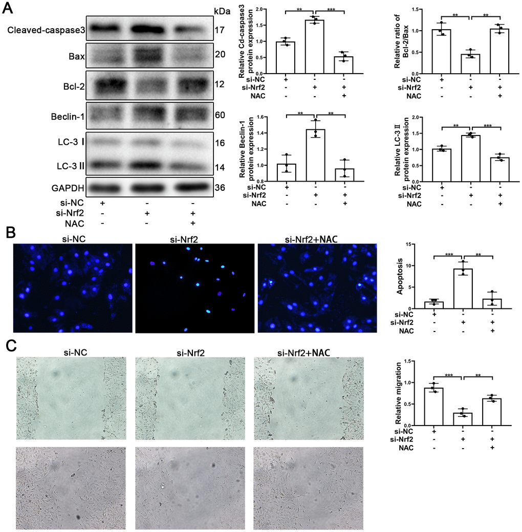 NAC (N-acetyl-L-cysteine, 10mM) [45] was used to investigate whether or not Nrf2 protected EPCs by suppressing ROS production. EPCs transfected with si-Nrf2 were treated with NAC. As can be seen in Figure 7A, Cleaved-caspase3 was found to have decreased and Bcl-2/Bax was found to have increased, indicating that apoptosis of EPCs induced by silencing of Nrf2 was reduced by NAC. Our results also indicated that autophagy was decreased in EPCs transfected with si-Nrf2. The results of Hoechst33258 confirmed that NAC attenuated the apoptosis of EPCs (Figure 7B). Importantly, our results indicated that NAC was capable of facilitating the migration and the tube formation ability of EPCs transfected with si-Nrf2 (Figure 7C and Supplementary Figure 3E). These results demonstrated that Nrf2 protected EPCs through inhibiting ROS production.