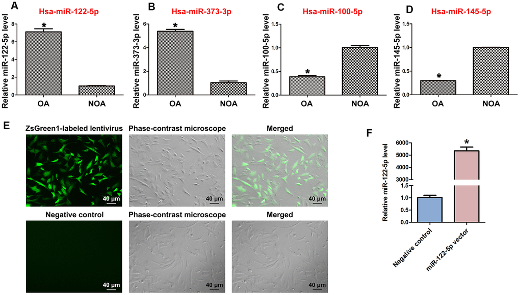 MiRNA microarrays were utilized by us to compare global miRNA profiles in human spermatogonia between OA and NOA patients [42]. Among the differentially expressed miRNAs, miRNA-122-5p was expressed at a higher level in human spermatogonia of OA patients compared to NOA patients, which was verified by our real-time qPCR (Figure 1A). These data indicate that miRNA-122-5p plays a potential role in regulating the fate determinations of human SSCs. In addition, we observed that miR-373-3p was expressed at a higher level in human spermatogonia of OA patients than NOA patients (Figure 1B), whereas the levels of miR-100-5p and miR-145-5p were lower in human spermatogonia of OA patients compared with NOA patients (Figure 1C, 1D).