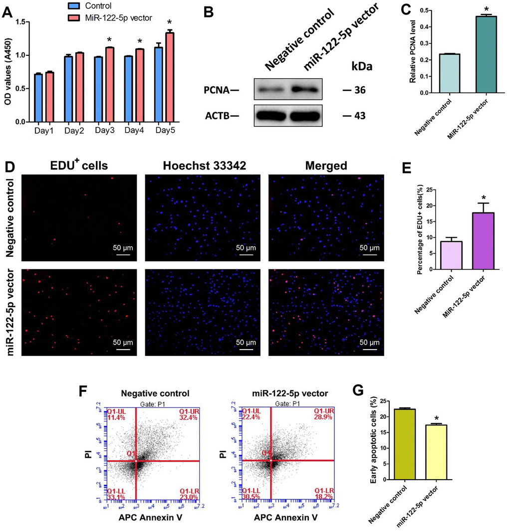 We determined the influence of miRNA-122-5p on the division of human SSC line using several methods. Cell proliferation assays revealed that the proliferation of human SSC line was obviously increased by miRNA-122-5p lentivirus compared to control lentivirus at day 3 to day 5 of culture (Figure 2A). Western blots demonstrated that level of PCNA protein was enhanced in human SSC line at day 5 by miRNA-122-5p lentivirus vs. the control lentivirus (Figure 2B, 2C). Moreover, EDU incorporation assay indicated that the percentage of EDU-positive cells was increased in human SSC line at day 5 by miRNA-122-5p lentivirus vector (Figure 2D, 2E). Collectively, these results suggest that miRNA-122-5p stimulates the division and DNA synthesis of human SSCs. Annexin V and propidium iodide (PI) staining and flow cytometry assays showed that miRNA-122-5p lentivirus reduced the early apoptosis but not the late apoptosis of human SSC line (Figure 2F, 2G), implicating that miRNA-122-5p inhibits the early apoptosis of human SSCs.