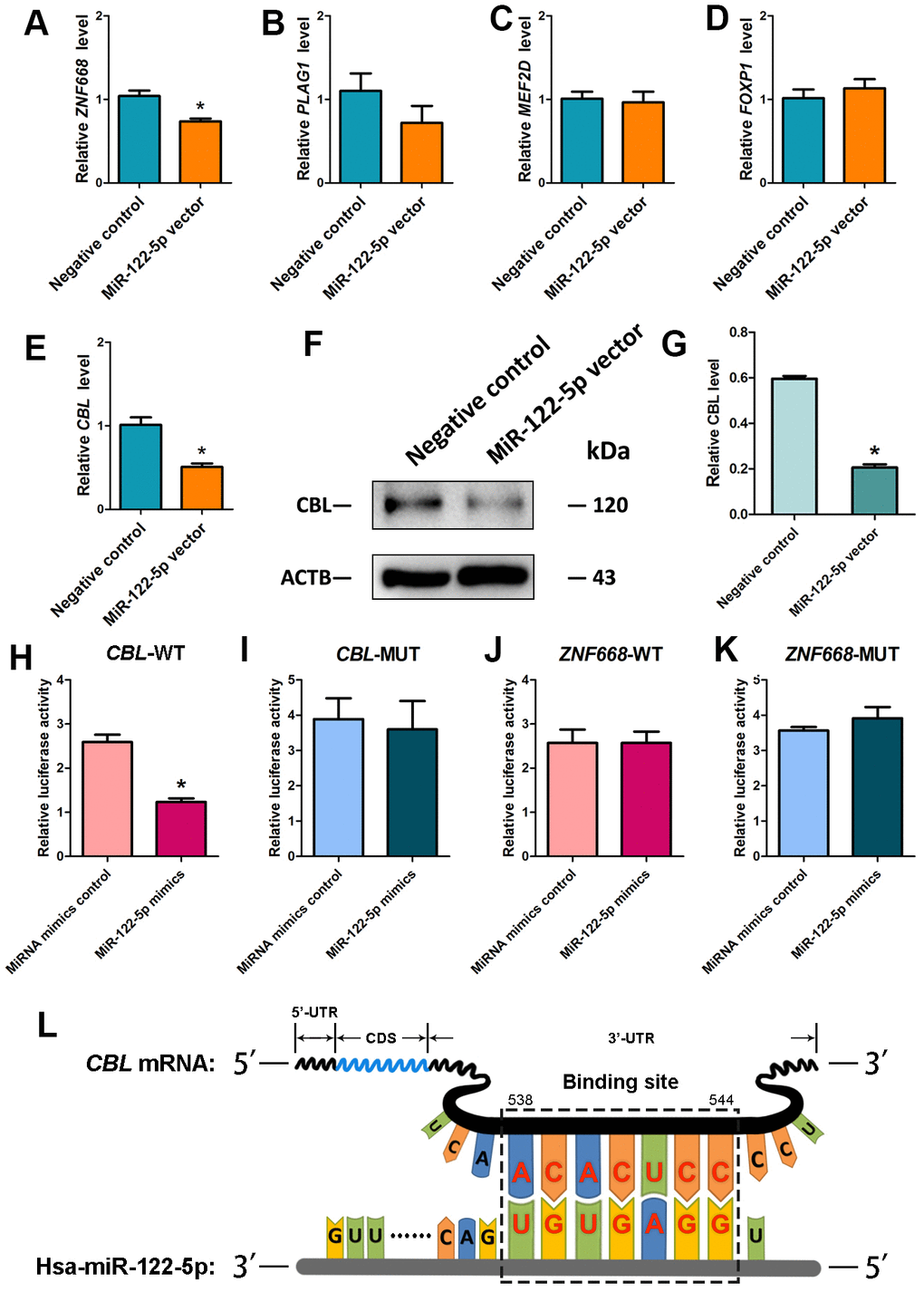 Using miRNA predict software, including Targetscan and miRDB, we predicted several potential targets of miR-122-5p. We verified these targets using real-time qPCR showing that the expression level of transcription factor CBL was downregulated by miRNA-122-5p lentivirus compared with other targets (Figures 3A–3E). Western blots further revealed that the level of CBL protein was significantly decreased by miRNA-122-5p lentivirus (Figure 3F, 3G). Therefore, CBL is one binding target of miRNA-122-5p in human SSCs. Furthermore, dual luciferase assays were performed to verify the binding cite of CBL mRNA. The predicted protein sequence in 3’UTR of CBL mRNA diminished the luciferase activity of the fusion genes in response to the treatment of miRNA-122-5p mimics (Figure 3H), whereas the mutated target sequence didn’t have any influence on the luciferase activity (Figure 3I). Neither the predicted target sequence in 3’UTR of ZNF668 mRNA nor the mutated sequence had any effect on the luciferase activity (Figure 3J, 3K). Considered together, these data suggest that CBL is a direct target of miRNA-122-5p in human SSCs. The binding of seed region (from the 2nd to 8th nucleotides) on miRNA-122-5p to the target 3’UTR sequence of CBL mRNA was illustrated in Figure 3L.