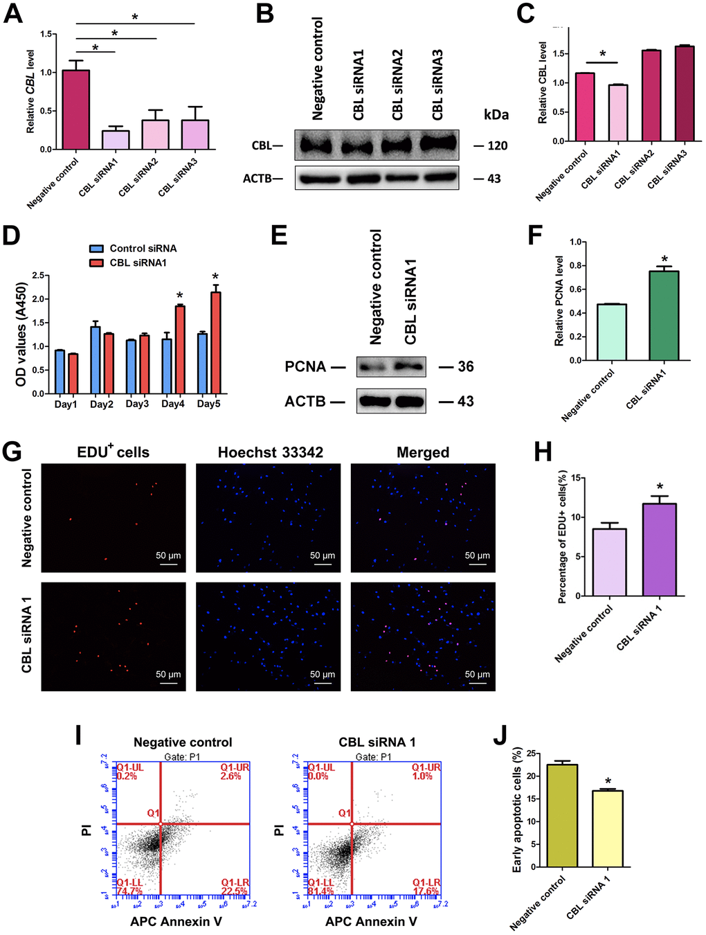 Proliferation assay showed that CBL siRNA1 enhanced the growth of human SSC line (Figure 4D), and PCNA protein level was increased in human SSC line at day 5 by CBL siRNA1 (Figure 4E, 4F). EDU incorporation assays demonstrated that the number of EDU-positive cells was obviously increased by CBL siRNA1 (Figure 4G, 4H). Annexin V and PI staining and flow cytometry assay indicated that CBL silencing led to the decrease in the early apoptosis of the human SSC line at day 3 (Figure 4I, 4J). Taken together, CBL knockdown stimulates the division and inhibits early apoptosis of human SSCs, which is consistent with the overexpression of miRNA-122-5p.