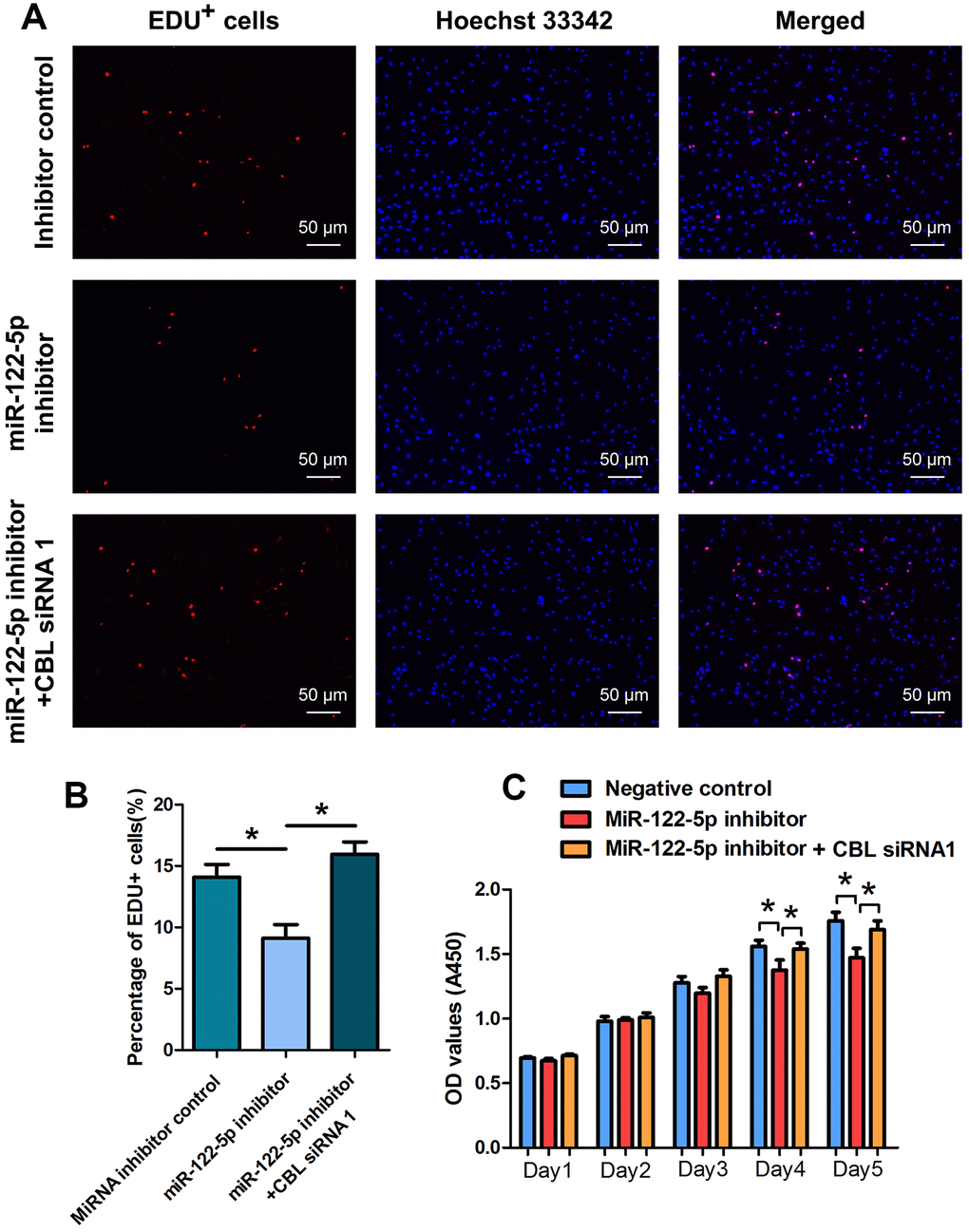 We examined whether CBL had the synergetic effect with miRNA-122-5p on human SSC line using rescue assays. As shown in Figures 5A, 5B, the reduction in EDU-positive cells by miRNA-122-5p inhibitor was counteracted by CBL silencing in human SSC line. CCK-8 assays revealed that the proliferation decrease of human SSC line caused by miRNA-122-5p inhibitor was neutralized by CBL silencing at day 4 and day 5 (Figure 5C).