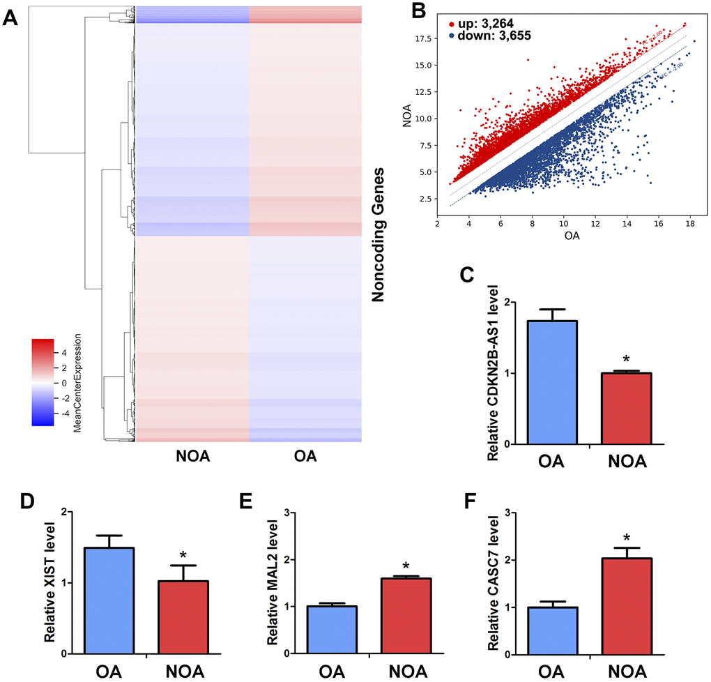 To further extend the molecular network of miRNA-122-5p in regulating the human SSCs, we compared and analyzed the profiles of lncRNAs in human spermatogonia between OA and NOA patients. As detected by an unbiased lncRNA microarray assay (Figure 6A), there were 6,919 lncRNAs whose expression levels were statistically significant (fold changes ≥ 2). In human spermatogonia between OA and NOA patients, 3,264 lncRNAs were upregulated whereas 3,655 lncRNAs were downregulated (Figure 6B). As predicted by Targetscan and miRDB software, we identified four lncRNAs that potentially had direct association with miRNA-122-5p from the differentially expressed lncRNAs in human spermatogonia between OA and NOA spermatogonia. These candidate lncRNAs were examined by real-time qPCR to validate the results of the microarray assay, and we found that CDKN2B-AS1 (Figure 6C) and XIST (Figure 6D) were expressed at higher levels in human spermatogonia of OA patients than NOA patients, whereas the levels of MAL2 (Figure 6E) and CASC7 (Figure 6F) were significantly lower in human spermatogonia of OA patients compared with NOA patients.