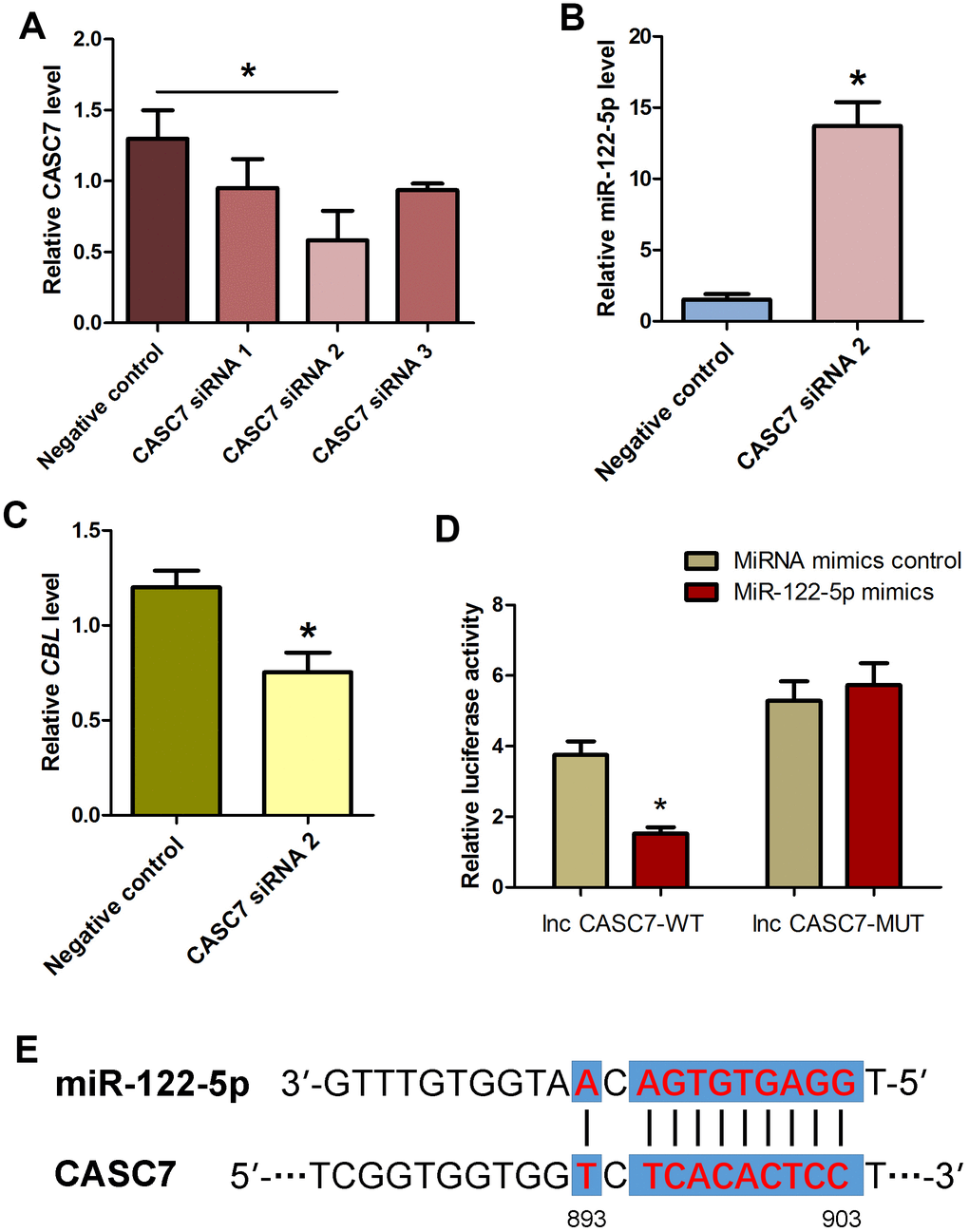 It has been reported that lncRNAs communicate with mRNAs [43–45], circular RNAs [46] and miRNAs [19, 47–50], and they act as endogenous miRNA sponges, ceRNAs or the targets of miRNAs. To explore whether CASC7 communicates with miRNAs in human SSC line, we investigated the influence of lncRNA CASC7 on the level of miRNA-122-5p and CBL in human SSC line. Three pairs of CASC7 siRNAs (i.e., CASC7 siRNA 1, CASC7 siRNA 2, and CASC7 siRNA 3) with different binding sites were employed. Real-time qPCR demonstrated that CASC7 siRNA 2 assumed the highest potential for silencing CASC7 among three CASC7 siRNAs (Figure 7A). After CASC7 knockdown by CASC7 siRNA 2, the level of miRNA-122-5p was upregulated (Figure 7B), whereas CBL transcript was decreased (Figure 7C). We also constructed luciferase reporter constructs containing either the wild-type (WT) binding sequence of CASC7 RNA or the mutant forms of the seed sites into the vector. Co-transfection of the miRNA-122-5p mimics and the WT dual-luciferase reporters into 293 T cells decreased about 50% of the luciferase activity (Figure 7D), while there was no significant change in mutation of the seed sequences compared to each control groups (Figure 7D). The seed site for miRNA-122-5p in the CASC7 RNA sequence was illustrated in Figure 7E. Thus, we have revealed a network of miRNA-122-5p-CBL axis that lncRNA CASC7 competes with the miRNA-122-5p and consequently suppresses the inhibition of CBL.