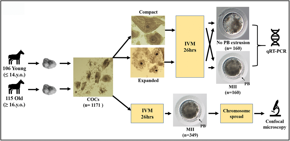 For the gene expression study, three hundred and twenty oocytes were divided into 8 groups on the basis of mare age (young versus old), cumulus appearance before maturation (compact versus expanded) and extrusion of the first polar body after maturation (MII and non-MII). For each of the 8 groups, 4 pools of 10 oocytes were used for mRNA extraction.
