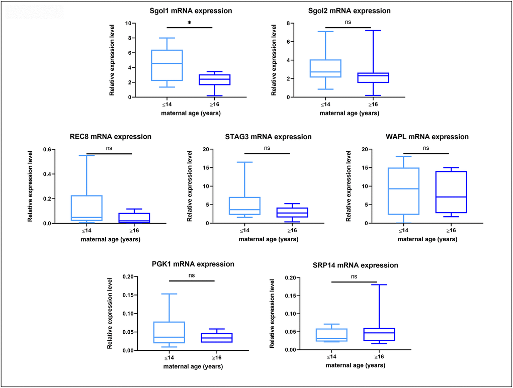 Quantitative RT-PCR revealed measurable mRNA expression for all of the target genes in all samples (Supplementary Figure 1), while amplification of the -RT blanks did not result in measurable amounts of product. No difference in the gene expression for Rec8, Stag3, Sgo2 and Wapl was found in oocytes from young and old mares, whereas Sgo1 expression was significantly lower in oocytes from old compared to those from young mares, irrespective of the success of maturation or initial cumulus appearance (Figure 5).