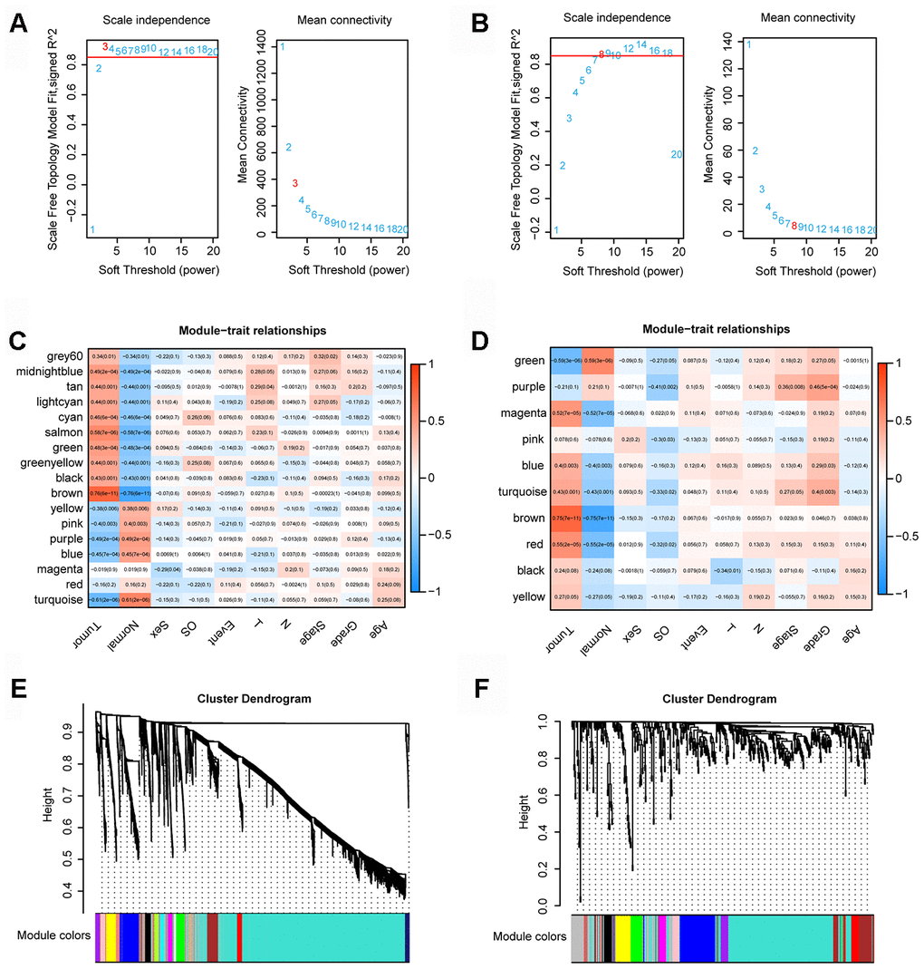We used the expression profiles of 4721 mRNAs/lncRNAs and 486 mRNAs/lncRNAs to construct a coexpression network with the WGCNA software package in R software. In the coexpression network analysis, the β values of lncRNAs/mRNAs and miRNAs were 3 and 8, respectively (Figure 1A, and 1B). Ultimately, we obtained 17 and 10 modules in the coexpression network of lncRNAs/mRNAs and miRNAs, respectively (Figure 1C and 1D). Moreover, we calculated and plotted the relationship between each module and clinical features. Figure 1E shows a strong negative correlation between the turquoise module and tumor characteristics (module-trait weighted correlation =-0.61). However, as shown in Figure 1F, there is a significant positive correlation between the brown module and tumor characteristics (module-feature weighted correlation = 0.75).