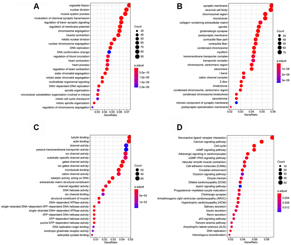 Functional enrichment analysis was performed to explore the Gene Ontology (GO) database terms and Kyoto Encyclopedia of Genes and Genomes (KEGG) pathways associated with genes in the turquoise module. The results indicated that the enriched biological processes mainly involved nuclear division, DNA replication, chromosome segregation, organelle fission and so on (Figure 2A). The cell components that were correlated with the resulting terms included chromosome, centromeric region, condensed chromosome, spindle and so on (Figure 2B). The results also showed that the molecular functions were related to DNA helicase activity, catalytic activity, acting on DNA, DNA-dependent ATPase activity, actin binding and so on (Figure 2C). KEGG pathway functional enrichment analysis showed that Cell cycle, p53 signaling pathway, cAMP signaling pathway, cGMP-PKG signaling pathway and DNA replication were the main pathways related to the genes in this module (Figure 2D).