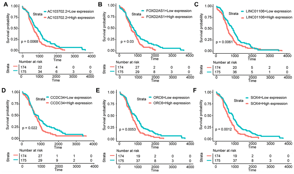Amo the 55 lncRNAs and 73 mRNAs, KM analysis revealed that 3 lncRNAs (LINC01106, FOXD2-AS1, and AC103702.2) and 3 mRNAs (CCDC34, ORC6, and SOX4) were identified as crucial prognostic factors. As shown in Figure 3A–3F, the survival time of GA patients with high LINC01106, FOXD2-AS1, AC103702.2, CCDC34, ORC6 and SOX4 expression was significantly shorter than that of patients with low expression. Therefore, the overexpression of LINC01106, FOXD2-AS1, AC103702.2, CCDC34, ORC6 and SOX4 may lead to a poor prognosis.