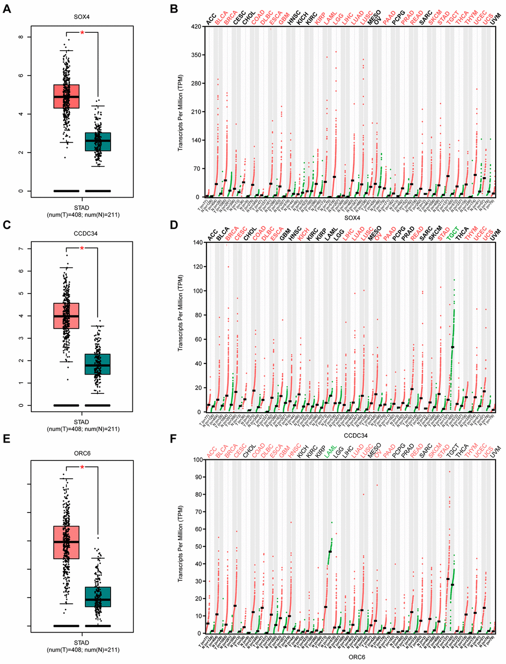 The protein encoded by ORC6 is a subunit of the ORC complex, which includes a core complex consisting of ORC2, ORC3, ORC4, and ORC5, loosely interacting with ORC6. Gene silencing studies with siRNAs demonstrated that this protein plays an essential role in coordinating chromosome replication and segregation with cytokinesis [15]. Research has also shown that the expression of ORC6 in colon cancer tissues is high and associated with invasion depth [16]. Moreover, a reduction in ORC6 expression sensitizes human colon cancer cells to 5-fluorouracil and cisplatin [17]. Our results suggest that ORC6 overexpression in GA likely causes poor OS.
