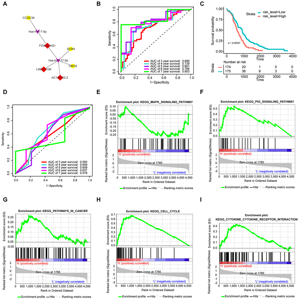 We obtained the connections between 3 lncRNAs (LINC01106, FOXD2-AS1, and AC103702.2) and 3 mRNAs (CCDC34, ORC6, and SOX4), whose P-value was < 0.05 in the survival analysis, from the lncRNA-miRNA and mRNA-miRNA relationship pairs. The results were visualized using Cytoscape 3.7.2 software. Next, multivariate Cox regression was used to identify the corresponding coefficients of the GA prognostic signature and to calculate the risk score (risk score = expGene1 ×βGene1 + expGene2 × βGene2 + expGenen × βGenen (exp, prognostic gene expression level; β, multivariate Cox regression model regression coefficients)) by using the R packages “glmnet”, “survminer” and “survival”. All samples were randomly separated into high- and low-risk groups with the median risk score as the cut-off value. Survival for each group was evaluated by the KM analysis and the log-rank test. The ROC curve and AUC were drawn with the R package “timeROC”.