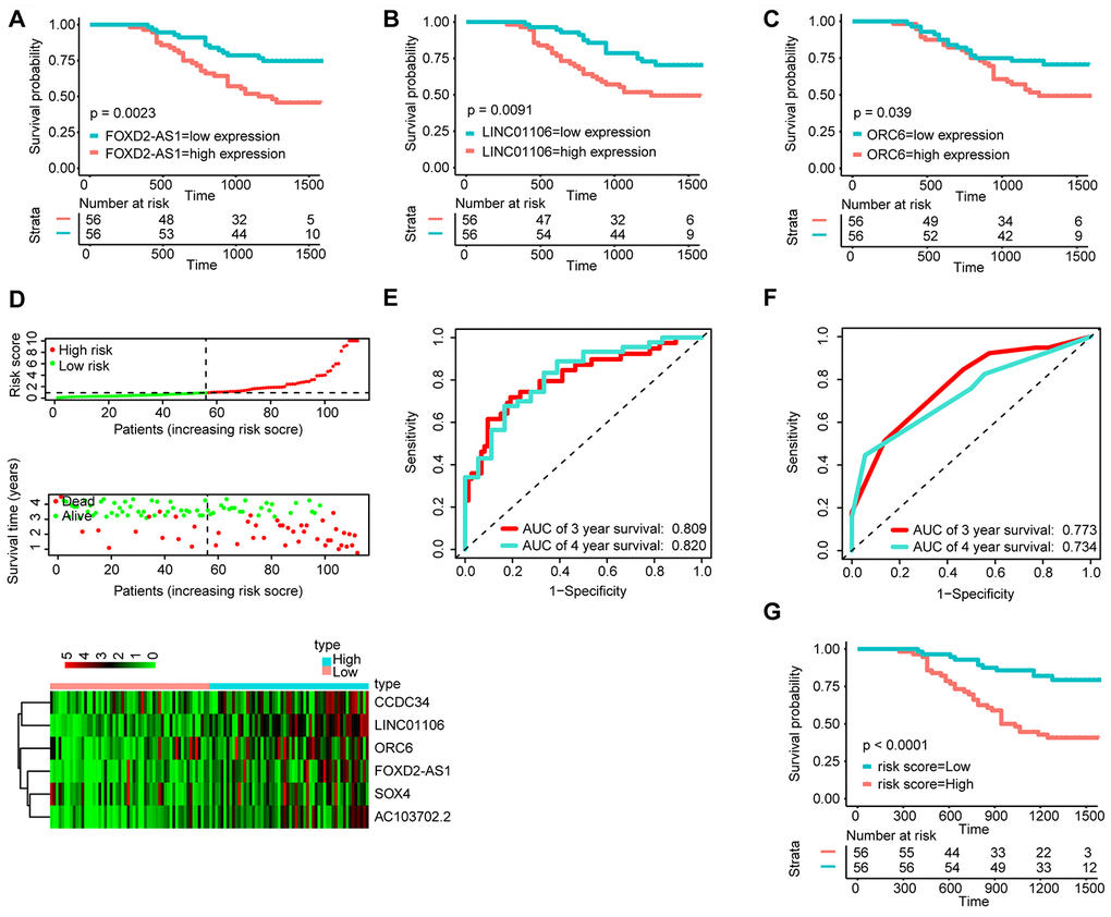 To determine the stability of the nomogram, we performed a similar process in the qRT-PCR validation cohort (n = 112). First, KM analysis was performed to identify the prognostic value of FOXD2-AS1, LINC01106 and ORC6 (Figure 6A–6C). Then, with the median risk score as the cut-off point, the patients were divided into the high-risk group (n = 56) and the low-risk group (n = 56) (Figure 6D). The AUC value for 3- and 4-year OS reached 0.809 and 0.820, respectively (Figure 6E), which were still higher than the AUC values of the traditional TNM pathological staging system (Figure 6F). The KM survival curves suggested that the OS of patients in the high-risk group was significantly worse than that of patients in the low-risk grop (Figure 6G).