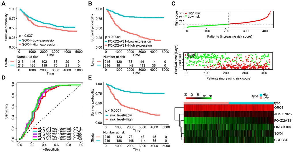 We also validated the robustness of the signature in the GSE84437 dataset (n = 431). The KM OS curves showed that the high expression of FOXD2-AS1 and SOX4 could be related to a poor prognosis (Figure 7A and 7B). Moreover, the median risk score was used as the cut-off point to divide patients into the high-risk group (n = 215) and the low-risk group (n = 216) (Figure 7C). The AUC value for 5-year OS reached 0.755 (Figure 7D). The KM OS curves indicated that the OS of patients in the high-risk group was significantly worse than that of patients in the low-risk group (Figure 7E). These results suggest that the new signature can effectively evaluate the prognosis of GA patients.