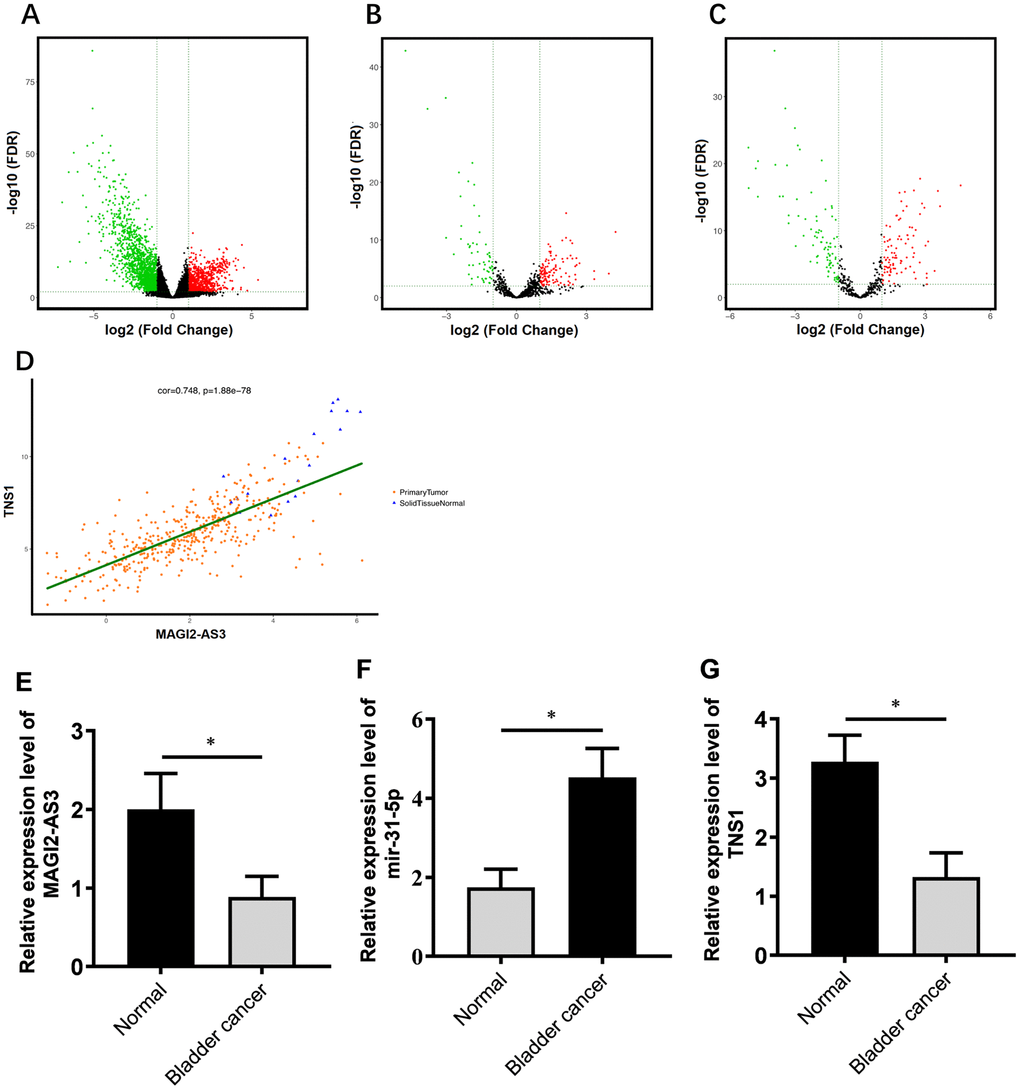 Next, we constructed a ceRNA regulatory network to identify functionally significant interactions between differentially expressed lncRNAs, miRNA and mRNAs in BCa tissues. We analyzed the correlations between differentially expressed lncRNAs and mRNAs using GDCRNATools and shinyCorPlot functions in R language and ranked lncRNA-mRNA pairs as shown in Table 1. The correlation between MAGI2-AS3 and TNS1 was ranked second. Since the functional relationship between MAGI2-AS3 and TNS1 has not been investigated in BCa, we chose them for further investigation. The distribution map of MAGI2-AS3 and TNS1 in BCa patients is shown in Figure 1D.