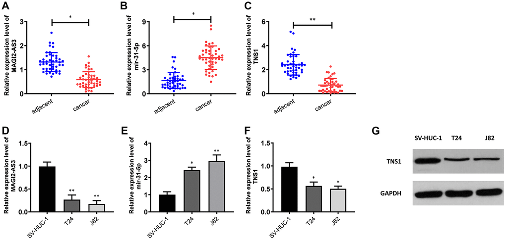 We performed qRT-PCR analysis to verify the expression of MAGI2-AS3, miR-31-5p and TNS1 in 45 pairs of BCa and adjacent normal urothelial tissues. QRT-PCR results showed that MAGI2-AS3 and TNS1 levels were down-regulated and miR-31-5p levels were up-regulated in BCa tissues compared to the adjacent normal urothelial tissues (Figure 2A–2C). Moreover, MAGI2-AS3 and TNS1 levels were significantly reduced and miR-31-5p levels were increased in the BCa cell lines (T24 and J82) compared to the normal urothelial cell line, SV-HUC-1 (Figure 2D–2F). Furthermore, western blot analysis showed that TNS1 protein expression was significantly downregulated in the BCa cell lines compared to the normal urothelial cell line, SV-HUC-1 (Figure 2G). These results demonstrate the regulatory relationship between MAGI2-AS3, miR-31-5p and TNS1 in BCa tissues.