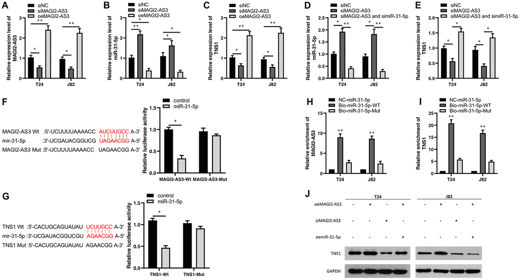 Moreover, western blot analysis showed that TNS1 protein levels were significantly upregulated in the MAGI2-AS3-OE group and downregulated in the siMAGI2-AS3 group (Figure 3J). However, miR-31-5p overexpression reduced the levels of TNS1 protein in the MAGI2-AS3 overexpressing T24 and J82 cells (Figure 3J). These results demonstrate a direct regulatory relationship between MAGI2-AS3, miR-31-5p and TNS1.