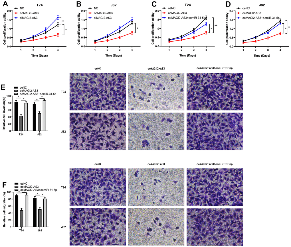 We analyzed the role of the MAGI2-AS3/miR-31-5p/TNS1 axis on the proliferation of BCa. MTT assays showed that MAGI2-AS3 overexpression inhibited BCa cell proliferation, whereas, MAGI2-AS3 silencing enhanced BCa cell proliferation (Figure 4A, 4B). Moreover, miR-31-5p overexpression increased the proliferation of MAGI2-AS3 overexpressing BCa cells compared to the corresponding controls (Figure 4C, 4D). Transwell migration and invasion assays showed that MAGI2-AS3 over-expression significantly reduced the numbers of migrating and invading BCa cells, whereas, miR-31-5p overexpression increased the migration and invasiveness of MAGI2-AS3 overexpressing BCa cells (Figure 4E, 4F). After siMAGI2-AS3, there was no significant difference in migration and invasion, possibly because the expression of MAGI2-AS3 in T24 and J82 cells was already very low. Overall, our results demonstrate that the MAGI2-AS3/miR-31-5p/TNS1 axis regulates proliferation, migration, and invasiveness of BCa cells.