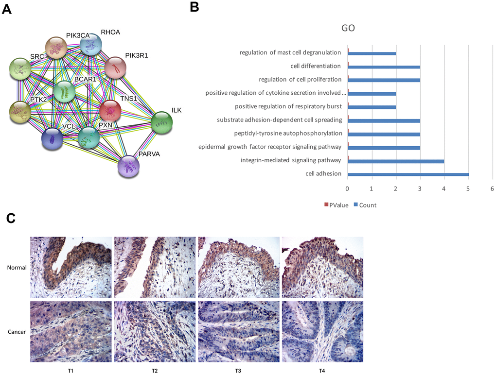 We used the STRING database and identified proteins interacting with TNS1 (Figure 5A). Functional enrichment analysis of TNS1 and TNS1-related proteins showed enrichment of cell adhesion pathway (Figure 5B). Tensin is a family of proteins involved in focal adhesion and includes four members, namely, tensin1 (TNS1), tensin2 (TNS2), tensin3 (TNS3) and C-terminal tensin-like (CTEN) [18–20]. TNS1 is a focal adhesion molecule that binds the actin cytoskeleton to the integrins and also forms a signaling complex through its multiple binding domains [19, 20]. We postulated that TNS1 may be related to tumor progression in BCa. Therefore, we analyzed the expression of TNS1 in 45 pairs of BCa and adjacent normal urothelial tissues at different T stages and the results are summarized in Table 2. Overall, the expression of TNS1 was significantly lower in the BCa tissues compared to normal bladder tissues; moreover, the expression of TNS1 was significantly lower in the advanced T stages (T3-4) compared to the patients in the lower T stages (T1-2) (Figure 5C). Based on the chi-square test, we found low expression of TNS1 correlated with lymph node metastasis in BCa patients (Table 2). Therefore, our results demonstrate that low TNS1 expression correlates with tumor progression and poor prognosis in BCa patients.