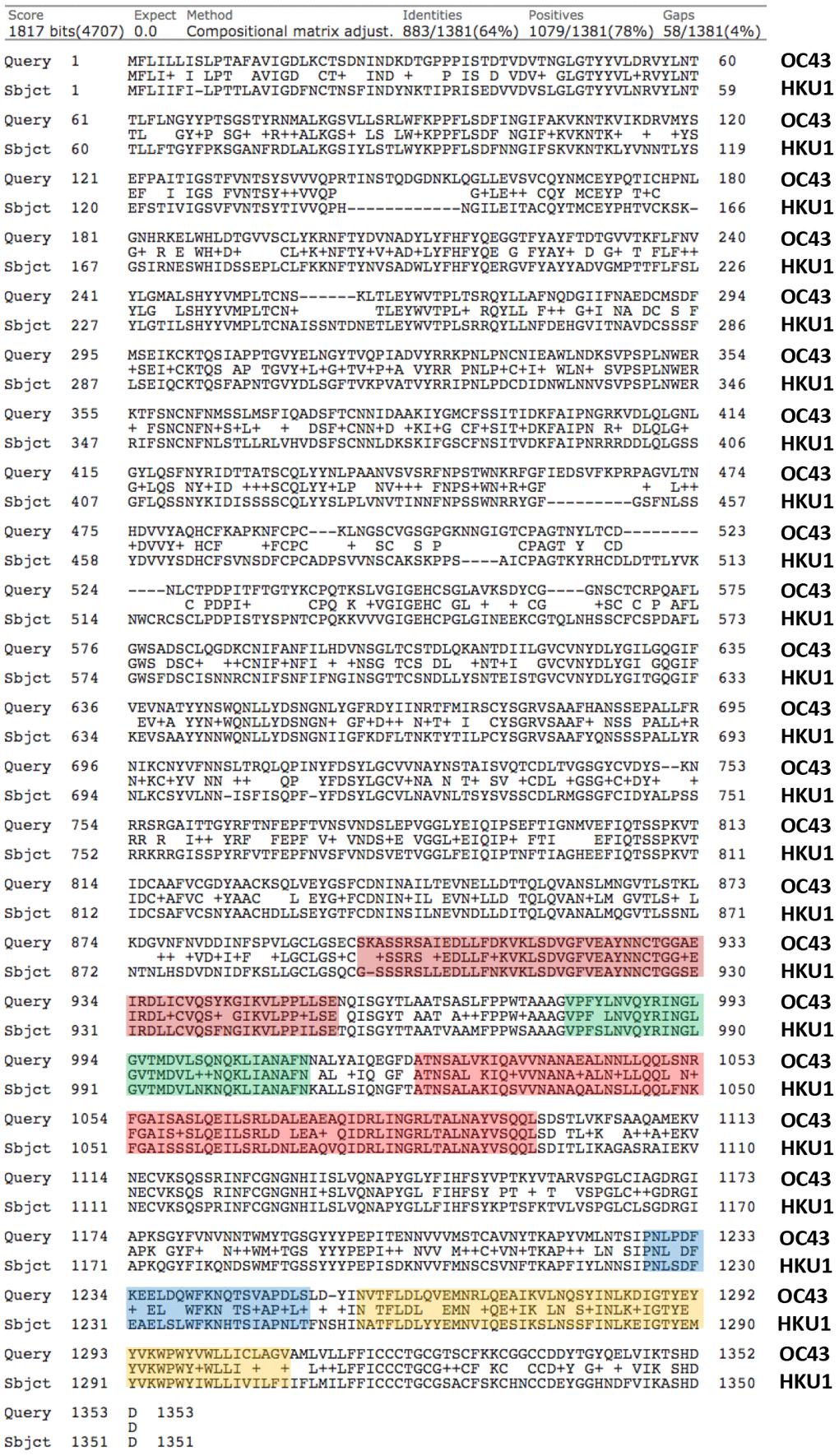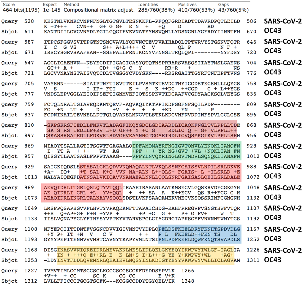 Based on this simple analysis, the viral spike glycoprotein of coronavirus OC43 appears to be the most similar to that of SARS-CoV-2, with nearly 38% identity and up to 53% similarity (Figure 1). In fact, the viral spike glycoproteins of coronavirus OC43 and HKU1 are also quite similar to each other, sharing 64% identity (Figure 2). So, both OC43 and HKU1 would possibly be good candidates for developing a potential vaccine to SARS-CoV-2.