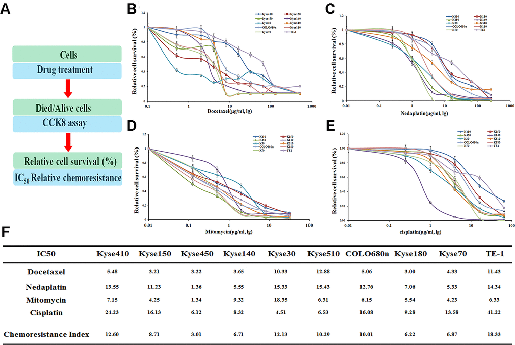 Judged by the chemoresistance index, these cell lines demonstrated varying drug-resistance capabilities against different drugs (Figure 1B–1E). Generally, several cell lines, including TE-1, Kyse410, Kyse30, Kyse510, and COLO680n, have an overall drug resistance index above 10, which show a more significant effect on the drug-resistance than the other five cell lines (Figure 1F). Notably, the TE-1 cell line is most resistant against the above four drugs with the IC50 value of 18.33, whereas the Kyse450 is the most drug-sensitive cell line with the IC50 value of 3.01.