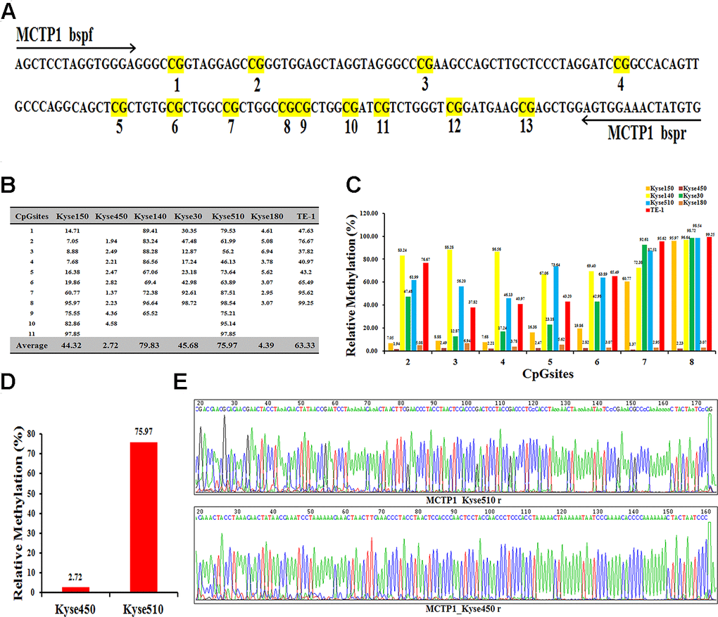 To find the insight that affects the drug-resistance of different EC cells, we performed the RNA-seq analysis with the help of UCSC, and found several genes to be differently expressed in EC cells. We selected MCTP1 as our target, which is one of the most differently expressed genes. Notably, the previous studies also indicated that MCTP1 participates in the drug-resistance in ovarian cancer cell lines [16, 18]. Sequence analysis showed that the promoter region of MCTP1 has total 13 CpG sites (Figure 2A). We thus detected the methylation status of the MCTP1 promoter region in seven EC cells by Bisulfite Sequencing PCR (BSP) assay. The results showed that 11 CpG sites among the total 13 CpG sites were methylated at varying ratios (Figure 2B, 2C). Generally, the cell lines Kyse140 and Kyse510 have the highest methylation ratios of 79.83 and 75.97, respectively (Figure 2B). By contrast, the Kyse450 cell line has the lowest methylation ratio of 2.72 (Figure 2B). Generally, the drug-resistance cell lines show a relatively higher methylation ratio, whereas the drug-sensitive cell lines have a much lower methylation ratio. The results clearly indicated that MCTP1 is hypermethylated in the drug-resistant EC cell lines. We selected the drug-resistant Kyse510 cell line with hypermethylation and the drug-sensitive Kyse450 cell line for the further studies (Figure 2D, 2E).