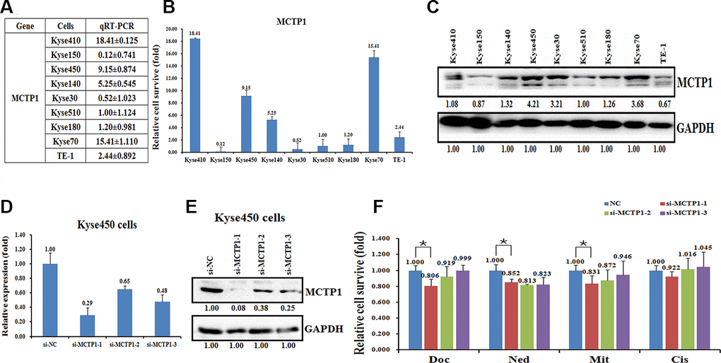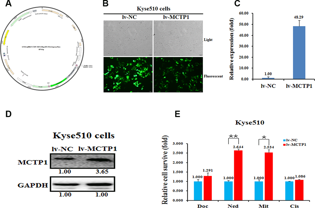 Next, we transfected three si-MCTP1 to down-regulate the MCTP1 level in the drug-sensitive Kyse450 cells and tested the drug-resistance ability against the four drugs. As expected, transfection of three si-MCTP1 significantly down-regulates its expression at both mRNA and protein levels (Figure 3D, 3E). Among the three si-MCTP1, the first si-MCTP1-1 one showed the highest silence ability, and resulted in mRNA and protein levels of only 0.29 and 0.08, respectively, compared to the control (Figure 3D, 3E). Accompanied with the decrease of MCTP1 in Kyse450 cells, the cells are less resistant against the above four drugs, as the relative cell survival ratio is a little bit decreased (Figure 3F). Notably, the si-MCTP1-1 has a most significant role in decreasing the cell survival rate in Kyse450 cells (Figure 3F). Conversely, we over-expressed GFP-tagged MCTP1 in Kyse510 cells to further test the drug-resistance effect (Figure 4A). The fluorescence assays showed that the GFP-MCTP1 construct is indeed expressed in the drug-resistant Kyse510 cells (Figure 4B). As a result, the Kyse510 cells harboring GFP-MCTP1 have a much higher expression of MCTP1, that are 48.29- and 3.65-folds at the mRNA and protein levels, respectively (Figure 4C, 4D). Following the up-regulation of MCTP1 in Kyse510 cells, the cells are somewhat more resistant against the four drugs (Figure 4E). All these results suggest that MCTP1 is positively correlated with the drug-resistance capability of EC cells, despite that the MCTP1 level is much lower in the drug-resistant EC cells.