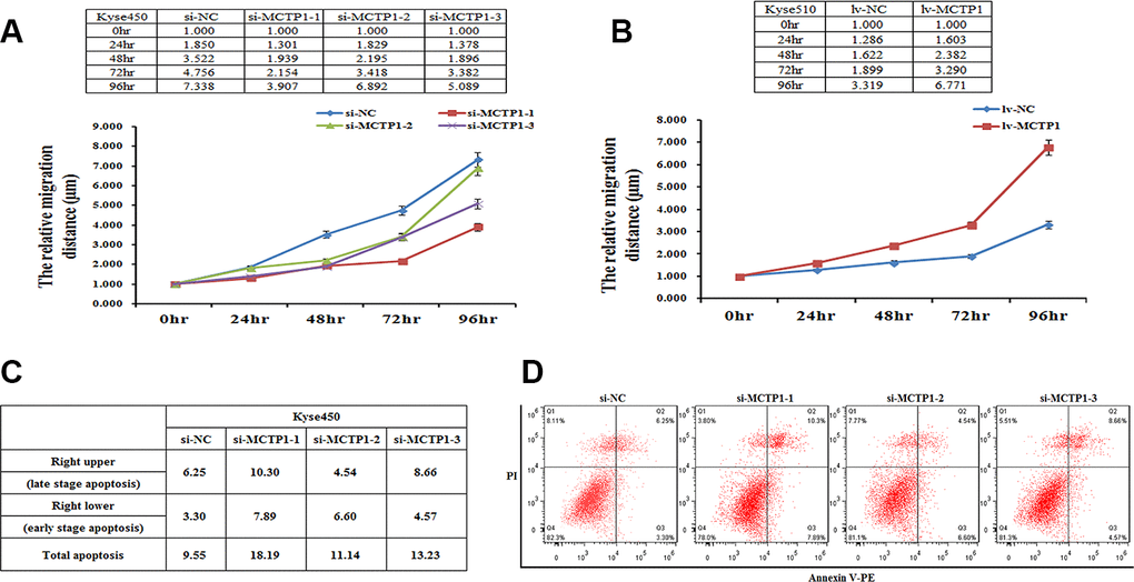 Then we performed the cell apoptosis assays to check whether MCTP1 may involve in this process. Using the Kyse450 cells with down-regulation of MCTP1 by transfecting si-MCTP1, we clearly found that the apoptosis rate is higher compared to the control cells (Figure 5C, 5D). Notably, the cells at both the late and early apoptosis stages are elevated, with the late-stage apoptosis cells of a majority contribution (Figure 5C, 5D). The results showed that MCTP1 not only confers the drug-resistance of EC cells, but also changes the properties of cell migration and apoptosis.