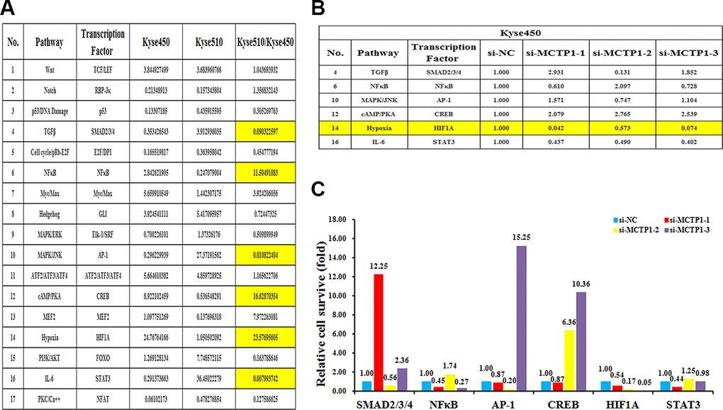 To further elucidate the underlying molecular insights into the MCTP1-mediated EC drug resistance, we measured the transcriptional activities of the seventeen classical signaling pathways in both Kyse510 and Kyse450 cells. The results showed the activities are differentially regulated in Kyse510 versus Kyse450 cells, among which eight pathways showed a higher activity in Kyse510 cells, whereas the other nine pathways had a higher activity in Kyse450 cells. More importantly, totally six pathways TGFβ, NFκB, MAPK/JNK, cAMP/PKA, Hypoxia and IL-6 differed by more than two-folds in Kyse510 and Kyse450 cells, suggesting that they might play a role in EC drug resistance. Among the six pathways, NFκB, cAMP/PKA and Hypoxia are up-regulated in the drug-resistant Kyse510 cells, whereas TGFβ, MAPK/JNK and IL-6 are down-regulated in the Kyse510 cells (Figure 6A). We then compared which of the six pathways correlated with the forced changes of the MCTP1 level in Kyse450 cells. As shown in Figure 6B, 6C, repression of MCTP1 expression of Kyse450 cells by three si-MCTP1 resulted in the up-regulation of cAMP/PKA pathway, but a down-regulation of Hypoxia and IL-6 pathways. As the activity of cAMP/PKA pathway is down-regulated in the Kyse450 cells, which has a higher MCTP1 level. Thus, down-regulation of MCTP1 in Kyse450 cells results in a higher activity of cAMP/PKA pathway, which perfectly meets the negative correlation of cAMP/PKA pathway and the MCTP1 level. Similarly, the changes of the activity of the IL-6 pathway coincides with the positive correlation with the MCTP1 level in the Kyse450 cells. Taken together, we propose that the cAMP/PKA and IL-6 pathways may involve in the MCTP1-mediated drug-resistance of EC cells.