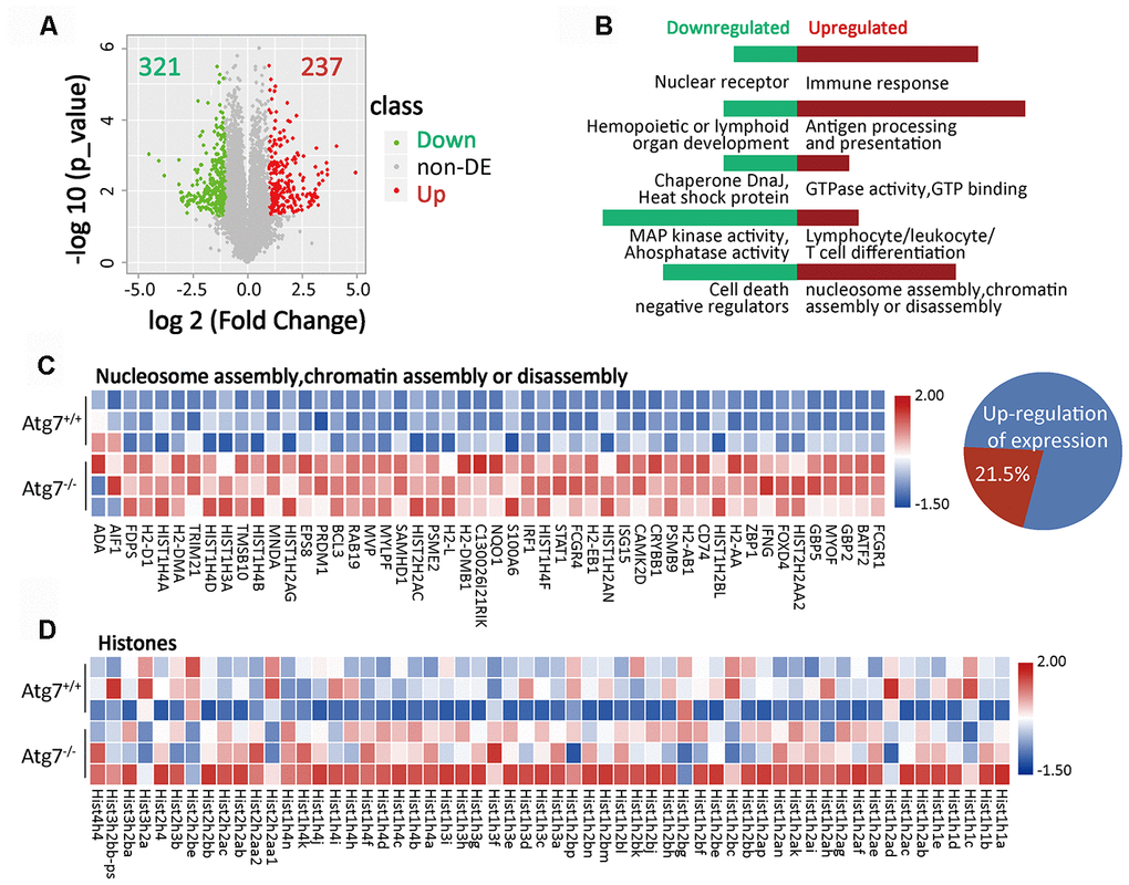 The pathway analysis showed that the capacity of nucleosome assembly or chromatin assembly was upregulated in the Atg7 deleted CD11b+Ly6G- cells (Figure 2B, right). Gene expression profiling further indicated that among all 237 abnormally up-regulated genes, 21.5% of the genes are pertinent to nucleosome/chromatin assembly (Figure 2C), suggesting that abnormality of nucleosome/chromatin assembly is the major consequence from loss of the Atg7 gene. Further expression profiling shows that an extensive array of histone members were abnormally upregulated at the transcriptional level in the Atg7 deleted CD11b+Ly6G- cells (Figure 2D). These data suggest that Atg7 deletion causes chaotic expression of genes in nucleosome/chromatin assembly.