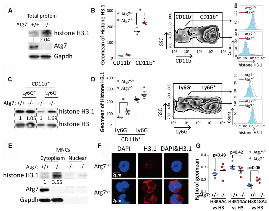 We next examined the protein level of histones, which are the backbone of nucleosomes. Western blotting results showed that Atg7 deletion increased total histone H3.1 in total bone marrow cells (Figure 3A). Flow cytometric analysis further revealed that it was CD11b+, not the CD11b- population, increased in protein level (Figure 3B), suggesting abnormal change exclusively in CD11b+ myeloid cells. Western blotting results further showed that the increase in histone H3.1 was limited to the CD11b+Ly6G- cells (Figure 3C), which was supported by flow cytometric analysis (Figure 3D). Atg7 deletion drove accumulation of H3.1 in the cytoplasm, leaving a minor portion in the nucleus, shown by the Western blotting analysis with bone marrow mononuclear cells (Figure 3E). Furthermore, confocal microscopy showed that Atg7 deletion caused accumulation of H3.1 in the cytoplasm, and this protein was hardly visible in the nucleus (Figure 3F). These results thus suggest that Atg7 deletion resulted in accumulated H3.1 protein trapped in the cytoplasm and caused a failure of H3.1 nuclear localization in the CD11b+Ly6G- cell population. To examine if abnormal cytoplasmic localization of H3.1 is caused by changes in acetylation of H3.1, we measured the levels of acetylated H3 proteins. The cytometric results showed that Atg7 deletion did not change acetylation levels of H3 at lysine 9, 14 or 18 (Figure 3G).