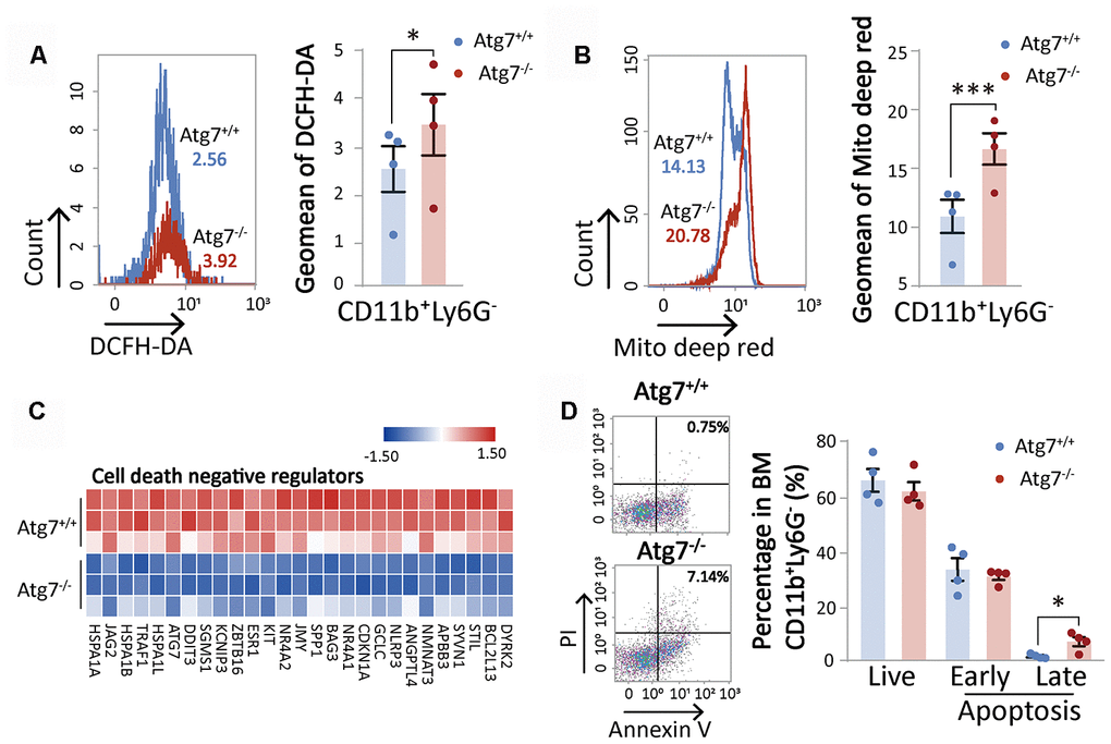 Our previous studies established that Atg7-deletion leads to not only speedy aging of the hematopoietic stem and progenitor cells, but also faster aging of non-hematopoietic organs [14, 15]. However, whether differentiated hematopoietic blood cells are affected by loss of Atg7 in terms of aging or lifespan has not been investigated. A functional study with flow cytometry showed that Atg7 deletion increased oxidative stress shown by increased reactive oxygen species (ROS) level (Figure 4A) and mitochondrial mass (Figure 4B) in the myeloid cells. Since mitochondria are a major compartment in the cell that produces ROS, it is likely that the increased ROS is at least partly attributed to the increase of mitochondrial mass. Increased mitochondrial mass and ROS are early triggers that drive cell aging. In the hematopoietic system, senescent cells can be killed by apoptosis [18], suggesting that speedy aging may accelerate programmed cell death. RNA sequencing data showed that Atg7 deletion down-regulated an array of proteins that inhibit the activation of programmed cell death (Figure 4C), and apoptosis was increased from Atg7 deletion (Figure 4D).