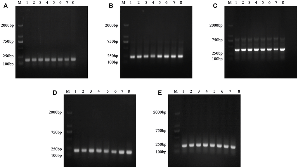 Conclusively, partial PCR products were randomly selected for direct sequencing verification. PRIMER 3.0 software was used for primer design and sent to General Biosystems (Anhui) Co., Ltd. for synthesis. The synthesized primer sequence and PCR product size were shown in Table 7. The PCR reaction program was pre-denaturation 94° C for 3 min, 31 cycles of 94° C for 30 s, 58.6° C for 30 s, and 72° C for 25 s, and a final extension at 72° C for 5 min. In the 1.1% agarose gel pool in 1×TAE electrophoresis solution, the PCR products (5 μl/well) of each sample were electrophoresed at 110 V for 25 min, and the agarose was treated with GoldView I. The target bands were detected on the Tanon 1600 gel imaging system (Tanon Science and Technology Co., Ltd.), and the amplified products were sent to General Biosystems (Anhui) Co., Ltd. for sequencing verification. The sequencing results were analysed by SeqManII software (DNASTAR, Madison, WI, USA).