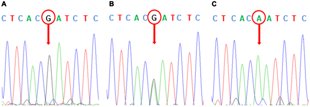 In order to verify the accuracy of the Sequenom MassArray genotyping method, we randomly selected some samples to verify the sequence of 5 SNPs. The image of agarose gel electrophoresis of the polymerase chain reaction (PCR) amplification products of some samples of DNA samples were shown in Figure 1. The wild homozygous sequence, heterozygous sequence and mutant homozygous sequence of the rs1045642 polymorphic site were listed in Figure 2.