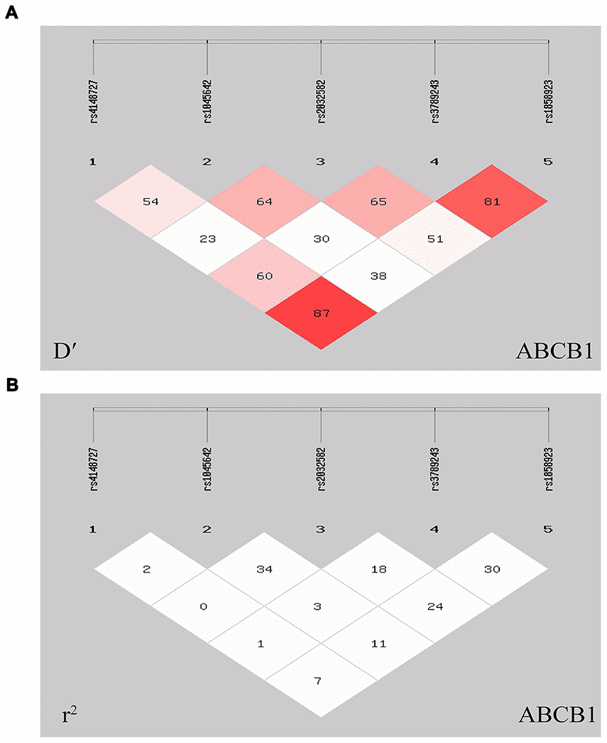 Table 4. SHEsis software analyzes the LD relationship of five polymorphisms of ABCB1, and uses D′ and r2 to measure the LD relationship between the five SNPs.