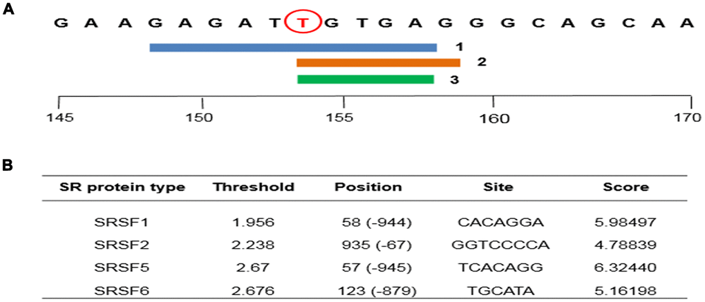 In order to determine whether rs1045642 affects the splicing efficiency, computer analysis was performed using HSF 3.1 and ESE finder 3.0 bioinformatics analysis software [42, 43, 45]. HSF 3.1 detects receptor (3'ss) and donor (5'ss) positions by a position weight matrix. ESE finder 3.0 software was used to estimate ESE sequences that change due to mutations. The default threshold was used to determine the locus responsible for the four Serine/arginine-rich (SR) proteins, including AS factor/splicing factor 2 (ASF / SF2), SR splicing factor 5 (SRp40), SR splicing factor 3 (SC35), SR splicing factor 6 (SRp55). The default thresholds for HSF were 1.956, 2.67, 2.383, and 2.6676, respectively. Only sequences with scores above or equal to the threshold were selected.