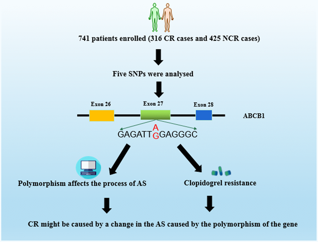 There is still controversial about the study between CR and polymorphism in patients with CHD. Previous studies on CR only performed polymorphic genotyping by collecting basic clinical information, test results, and patient blood samples, and then statistical analysis to obtain genotypic analysis and CR. However, the mechanism of clopidogrel-related drug resistance has not been further studied. In the current study, we not only did the predecessor research, but also predicted the SNP of clopidogrel-related genes through bioinformatic software. It was predicted that rs1045642 SNP site will potentially affect the AS of the ABCB1 gene. Therefore, we hypothesize that the mechanism of CR might be caused by a change in the AS caused by the polymorphism of the gene. Our research not only provides theoretical guidance for the clinical individualization of clopidogrel in patients with CHD, but also provides new idea for the study of the mechanism of CR. Meanwhile, specific experiments are needed to support our findings.