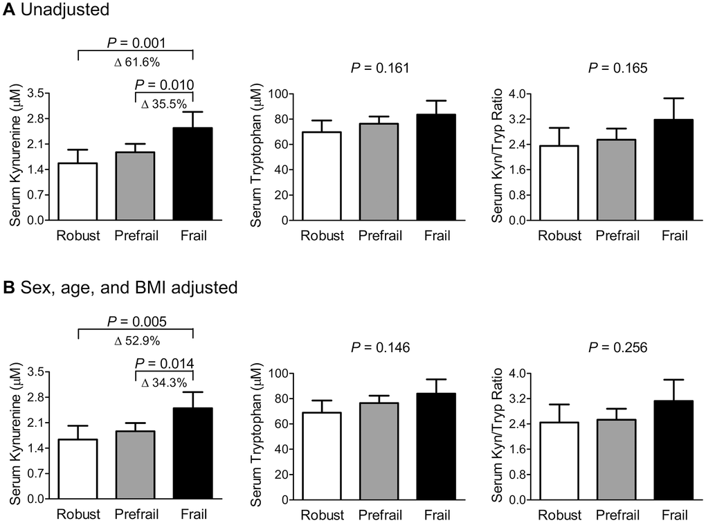 Before their levels were adjusted for sex, age, and BMI, the frail group had 61.6% and 35.5% higher serum kynurenine levels than the robust and prefrail groups, respectively (Figure 1A), and the statistical significance persisted after adjusting for these factors (Figure 1B). However, there were no significant differences in serum tryptophan levels and kynurenine/tryptophan ratio between the three groups, regardless of the adjustment models.