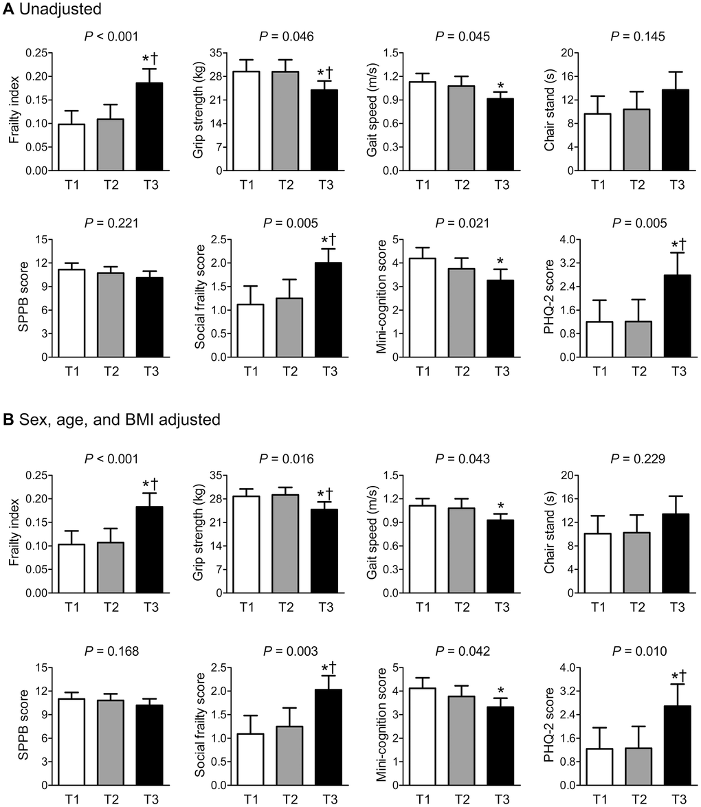 | Phenotypic frailty is defined based on the Fried’s criteria. Values are presented as the mean ± standard deviation unless otherwise specified.Bold indicates statistically significant values. The comparisons between the three groups were investigated using the analysis of variance with posthoc analysis via Tukey’s honest significance test for continuous variables and Fisher’s exact tests for categorical variables. * and † indicate statistically significant differences from robust and prefrail groups, respectively. | |||||||||||||||||||||||||||||||||||||||||||||||||||||||||||||||||||||||||||||||||||||||||||||||||||