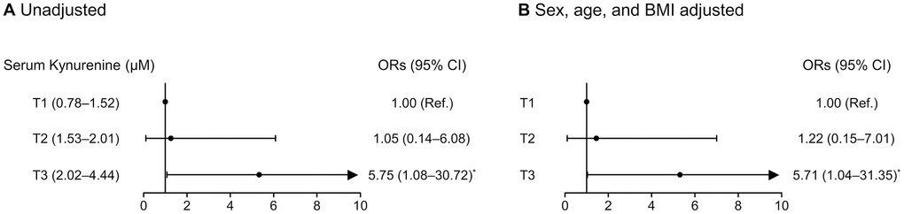 Logistic regression analyses revealed that the ORs for phenotypic frailty were 5.75-fold and 5.71-fold higher for the participants in the highest kynurenine tertile (T3) than those in the lowest tertile (T1), before and after adjusting for sex, age, and BMI, respectively (Figure 3).
