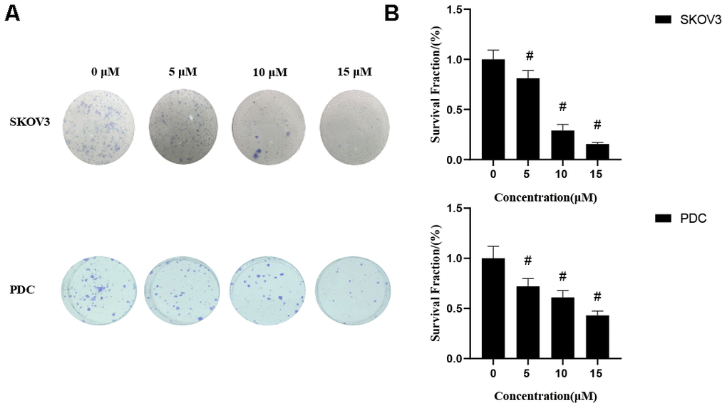 We first determined the inhibitory effects of cardamonin on proliferation of SKOV3 and PDC cells. In this experiment, we used DMSO as the negative control. MTT assay result showed that cardamonin inhibited proliferations of SKOV3 and PDC cells to a significant extent in a dose-dependent manner (Figure 1). The median inhibition concentration (IC50) values at 24 h, 48 h, and 78 h were 32.84 μM, 8.10 μM, and 8.04 μM, respectively. (c) Graph showing the inhibitory effect of cardamonin on proliferation of patient-derived cells (PDC). The median inhibition concentration (IC50) values at 24 h, 48 h, and 78 h were 149.40 μM, 84.20 μM, and 14.87 μM, respectively. In addition, we observed dose-dependent suppressions of colony formation in SKOV3 and PDC cells treated with cardamonin (Figure 2).